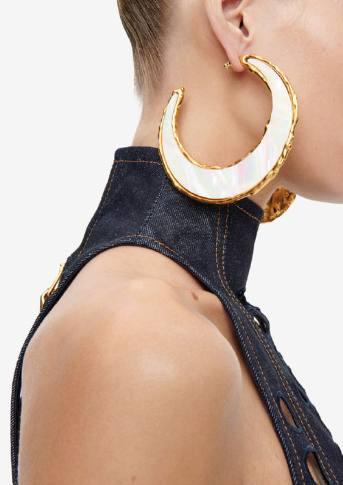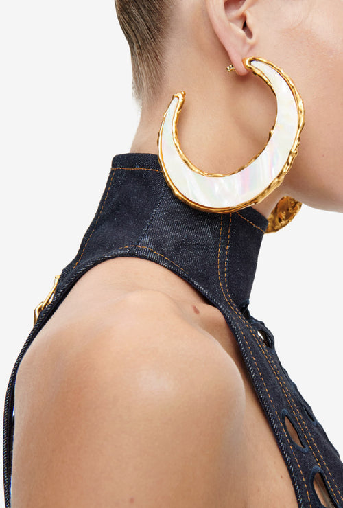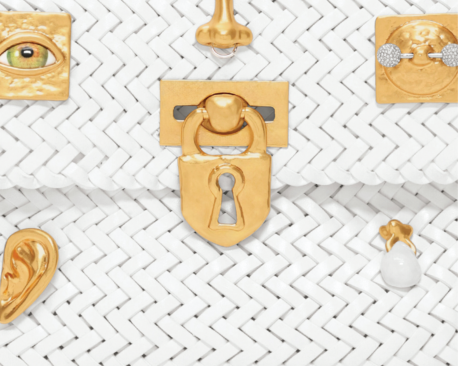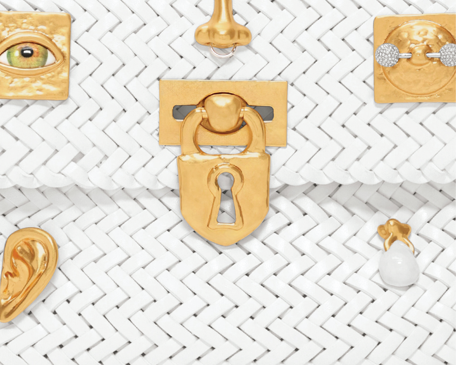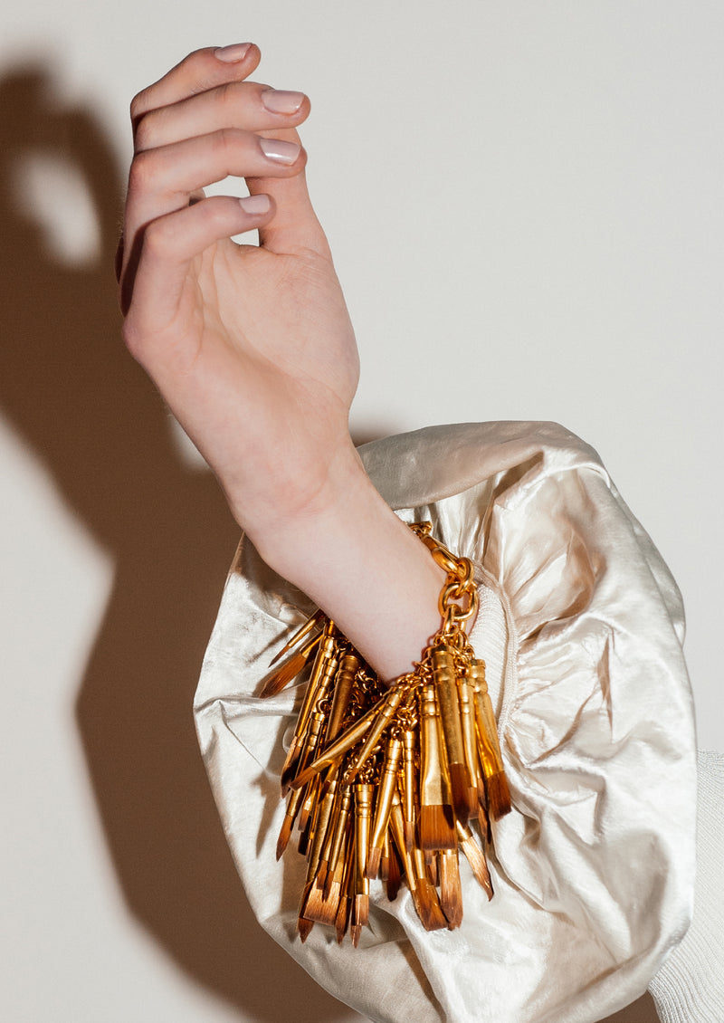 Des artistes surréalistes ont collaboré avec Schiaparelli pour concevoir des accessoires et des boutons bijoux uniques, comme Alberto Giacometti qui a créé une série de broches et de boutons en métal doré en forme de gorgones, de sirènes, d’oiseaux et d’anges dans les années 1930. Aujourd’hui, Daniel Roseberry distille les codes de la Maison en or Schiaparelli pour orner ses créations.