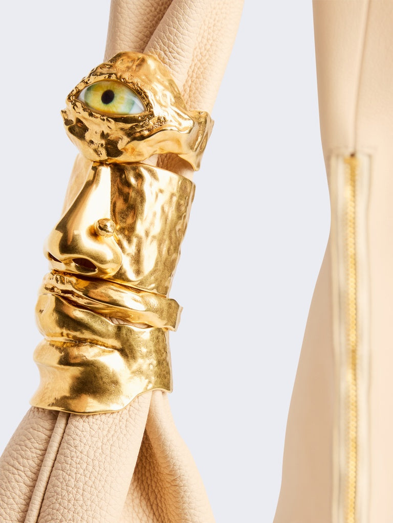 Notre sac Soufflé aux lignes courbes est confectionné dans un cuir de veau grainé sable rehaussé de bijoux Anatomie signature en laiton doré martelé formant un visage sur l' anse.
