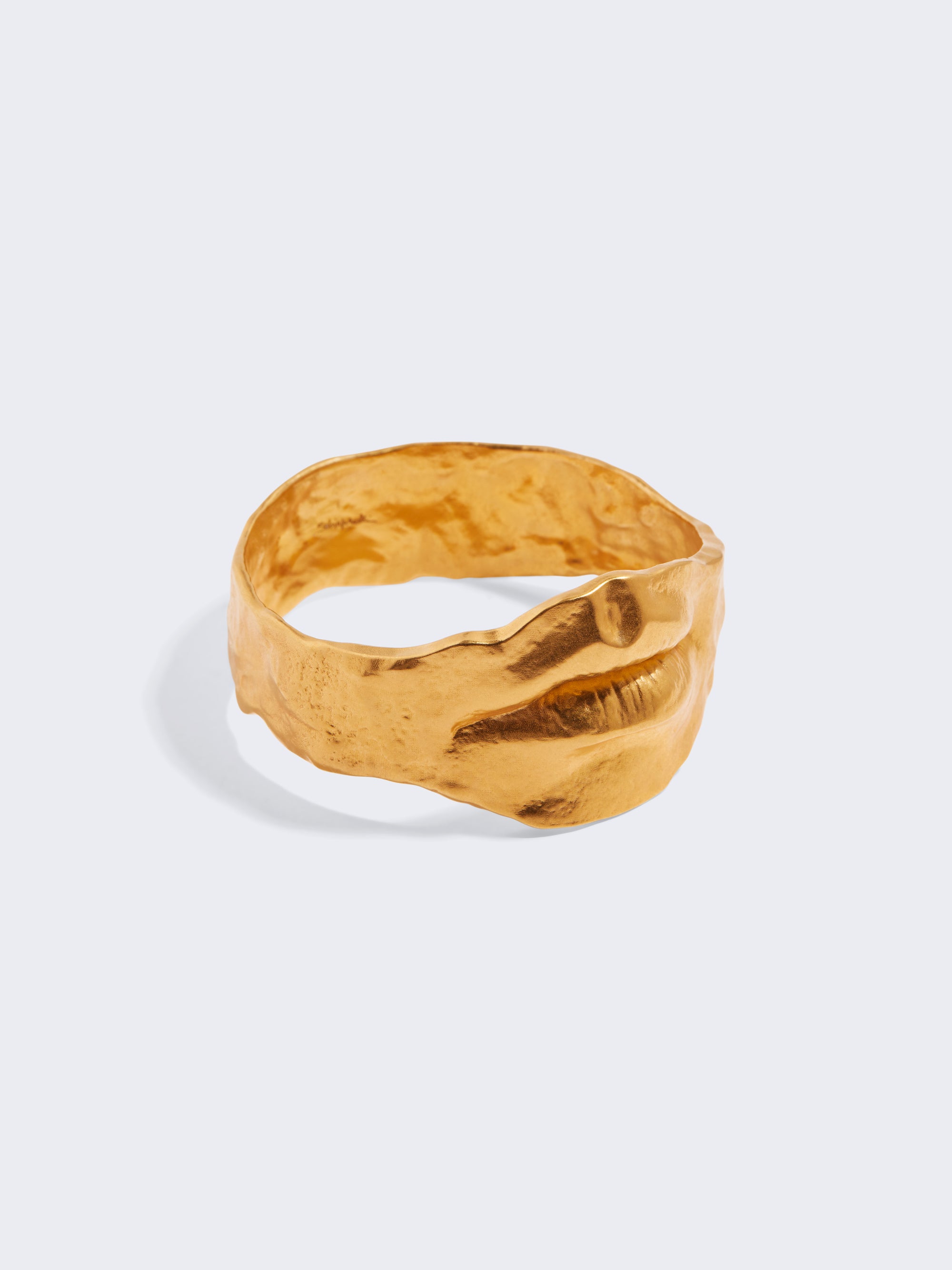 Ce bracelet manchette représentant une Bouche signature en laiton doré martelé et émail rend hommage aux codes anatomiques emblématique de la Maison.
