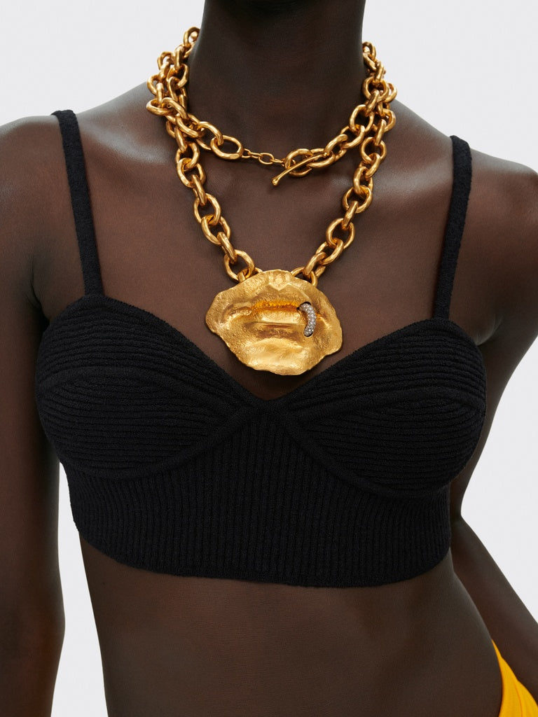 Collier en laiton doré composé d'une chaîne à gros maillons martelé, et d'un pendentif : une Bouche moulée. Bouche ornée d'un piercing argenté avec détail en crystal Swarovski.