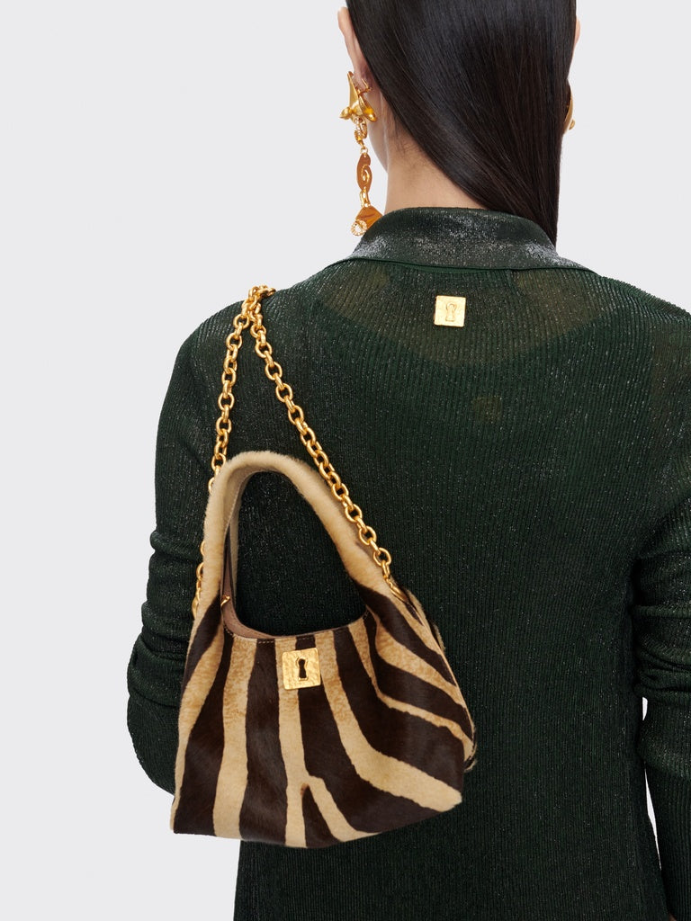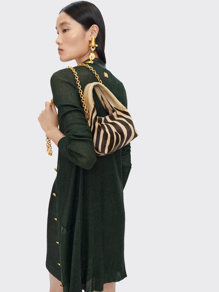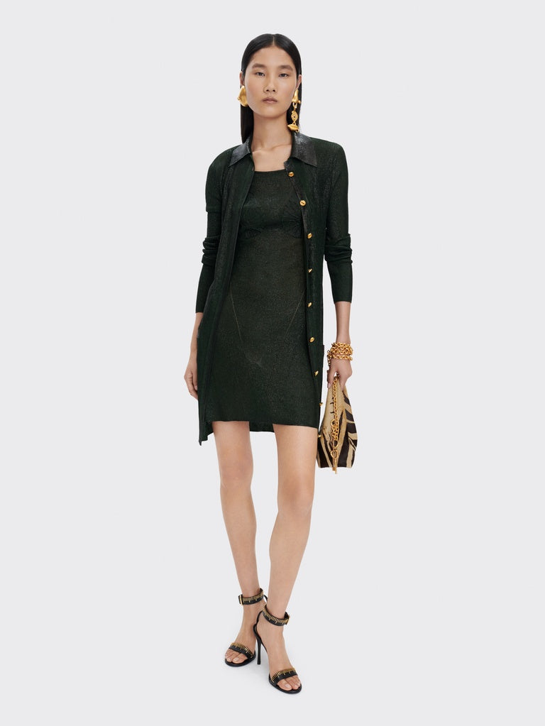 Ce long cardigan chemise à fines côtes en maille viscose noire avec lamination vert foncé est rehaussé de boutons bijoux en laiton doré martelé sur le devant.