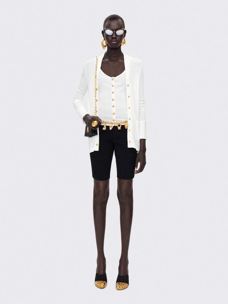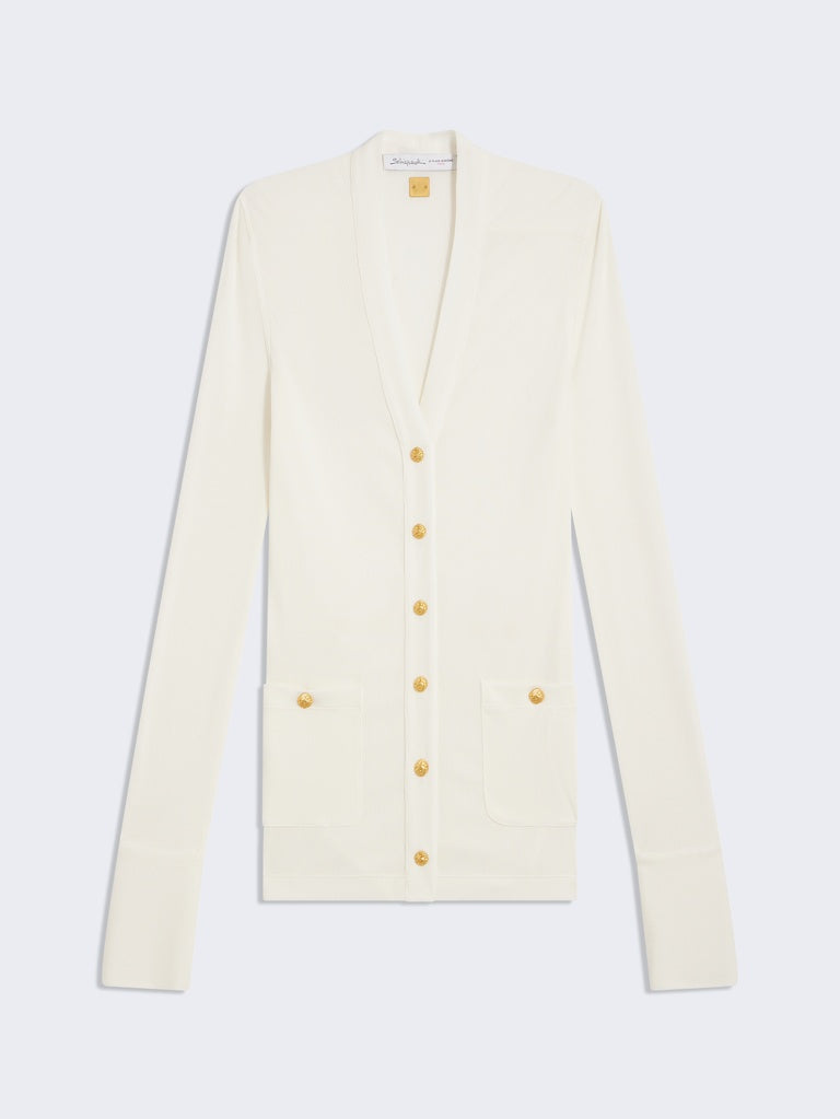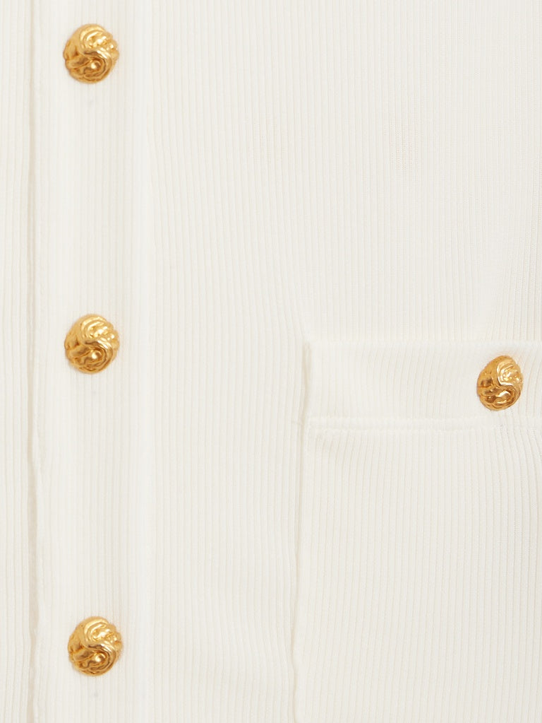 Ce cardigan près du corps en jersey côtelé viscose écru est décoré de boutons bijoux en laiton doré martelé sur le milieu devant, sur les poches plaquées et en bas de manches.