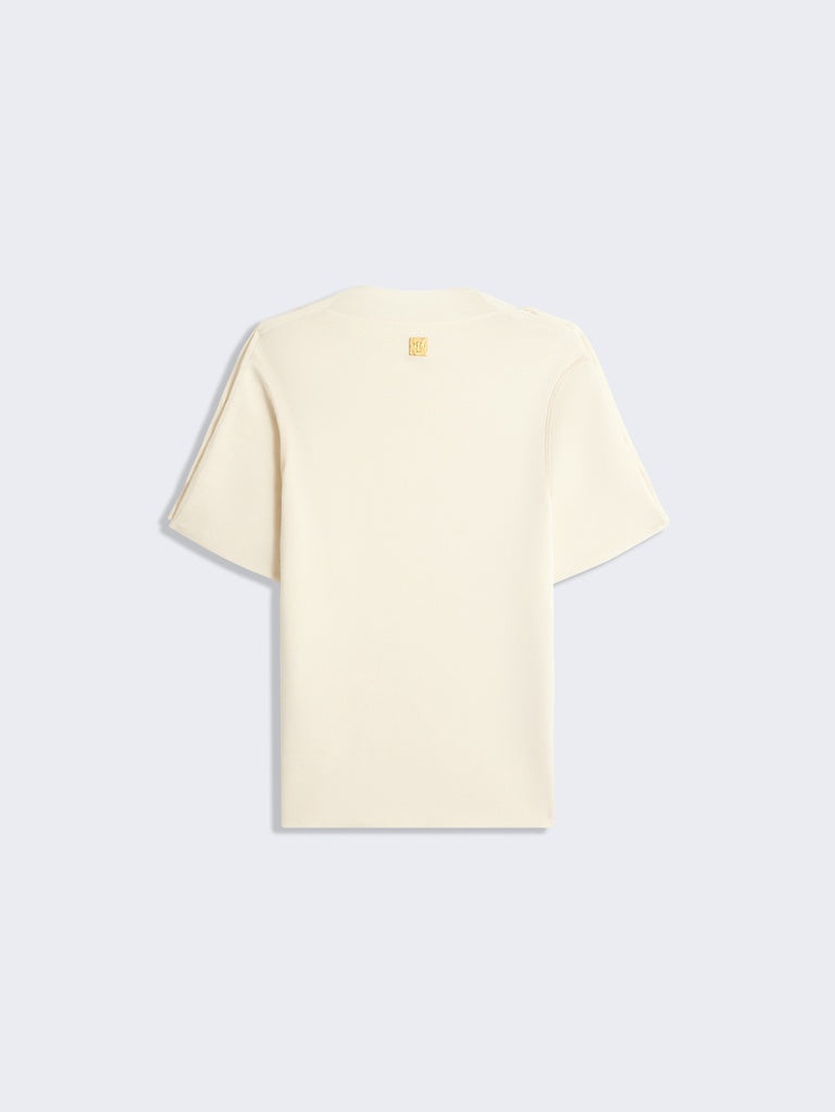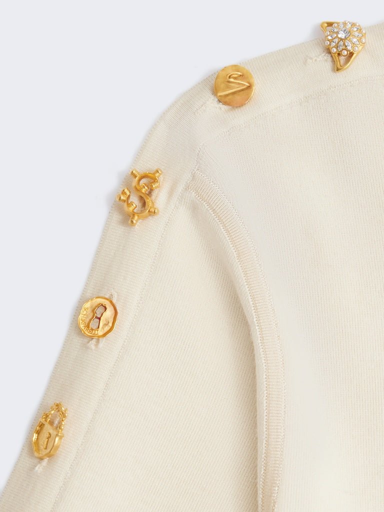 Ce pull à col rond et manches courtes à la coupe moulante en cachemire ecru est réhaussé de boutons bijoux signature en laiton doré martelé au niveau des épaules.
