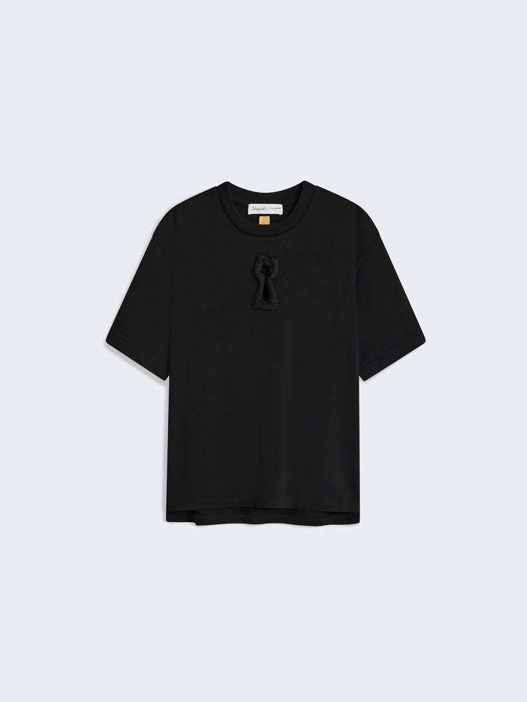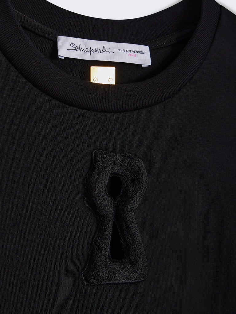 Ce tee-shirt à col rond et manches courtes en jersey de coton noir est décoré d'une broderie Trou de Serrure signature ton sur ton sous l'encolure.