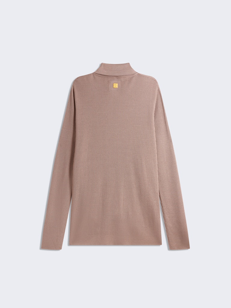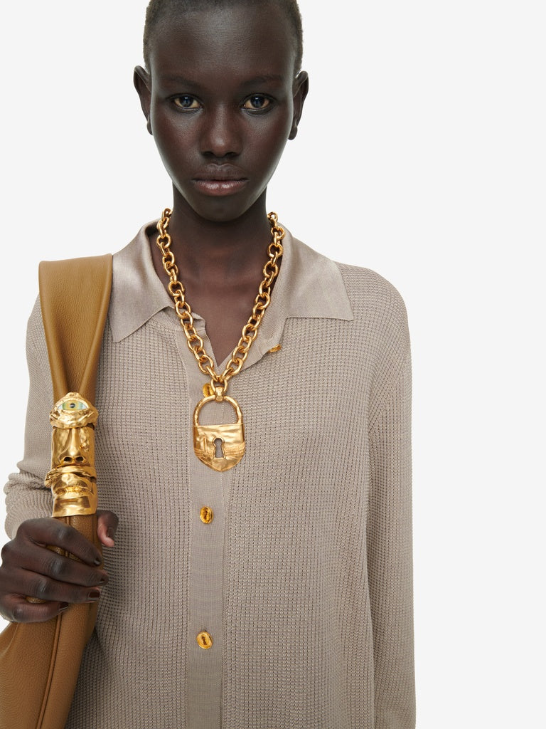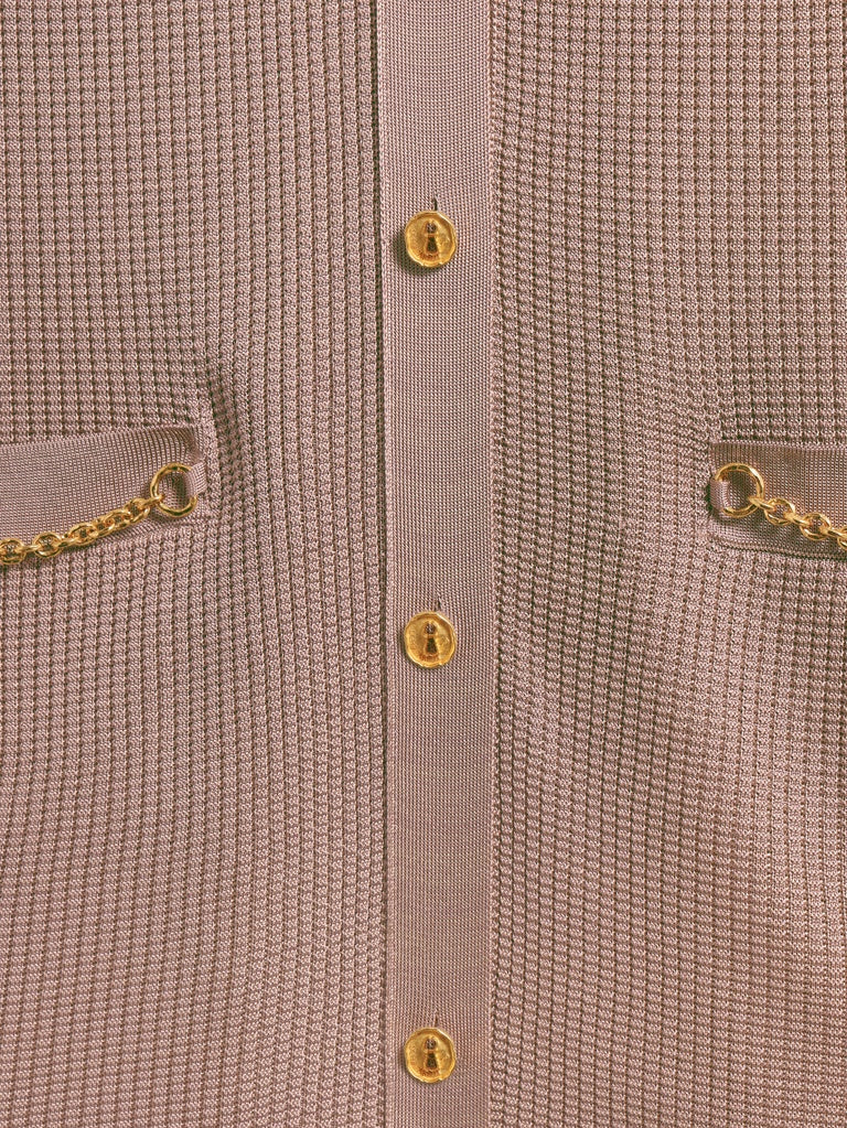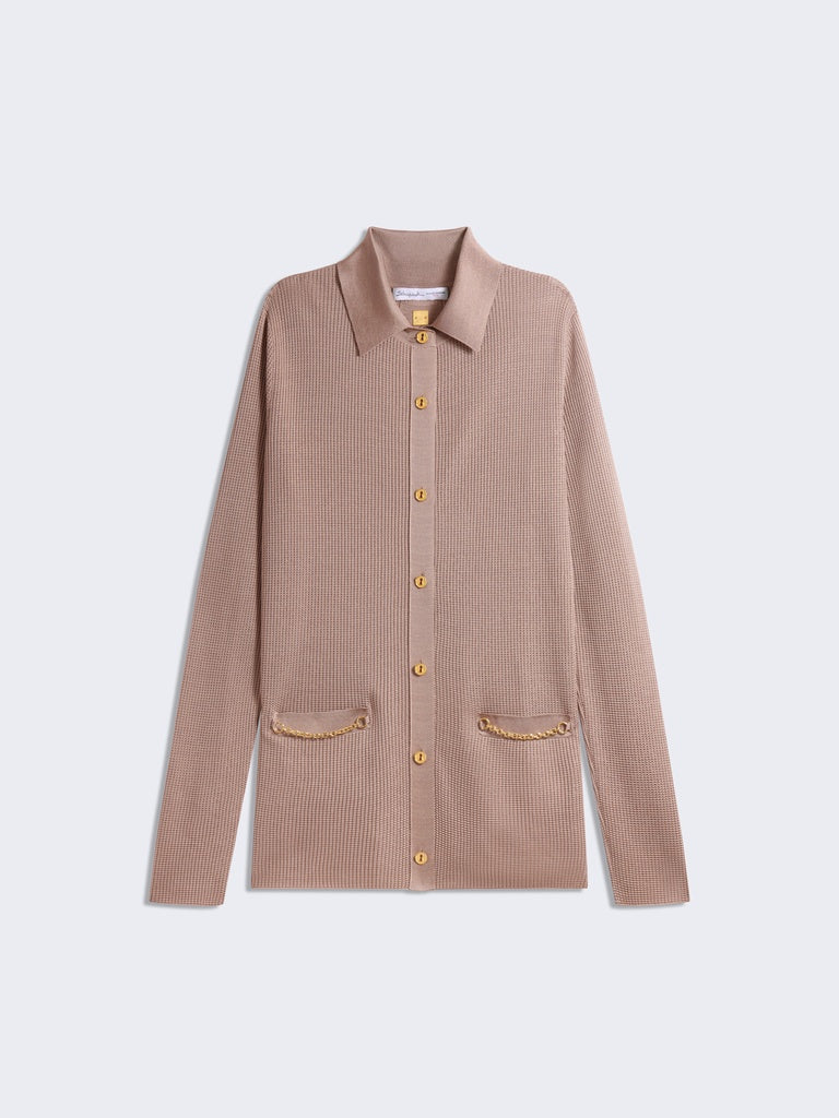 Chemise en maille texturée en viscose couleur taupe ornée de boutons Trou de Serrure dorés de chaînes en métal doré sur les poches.
