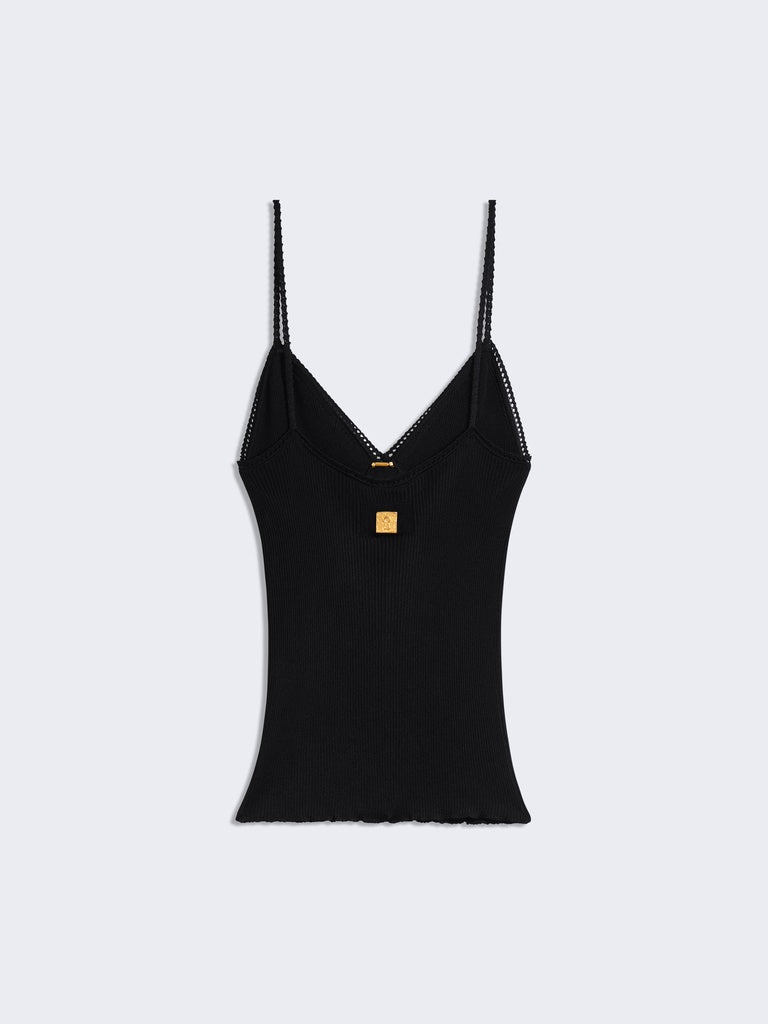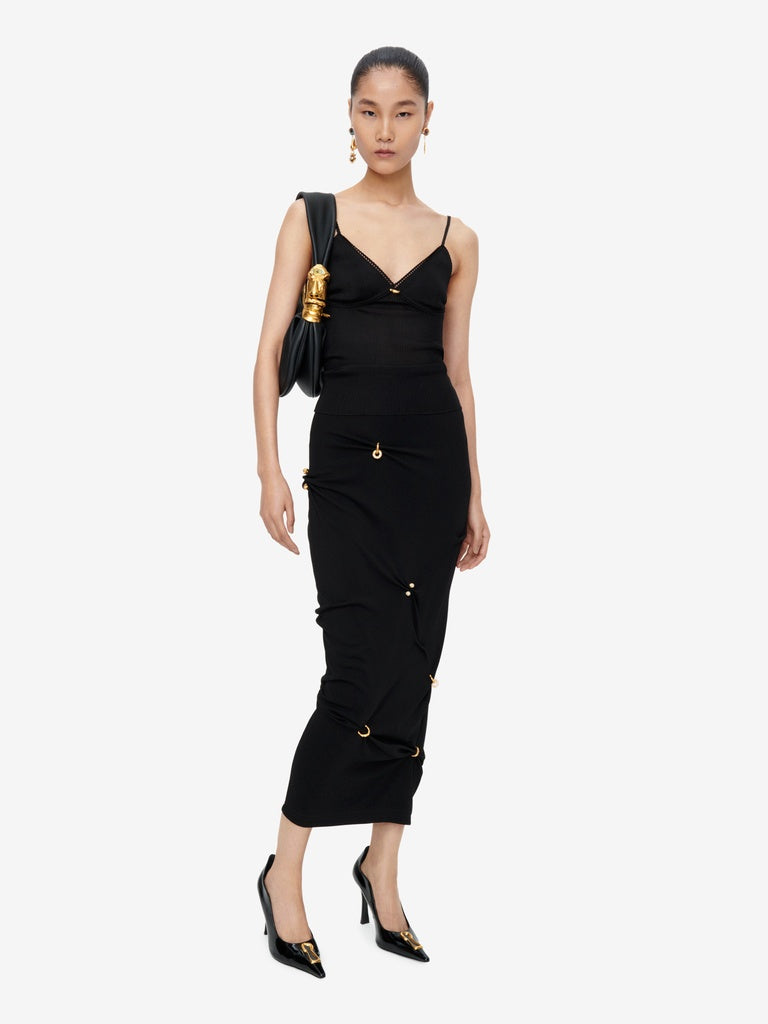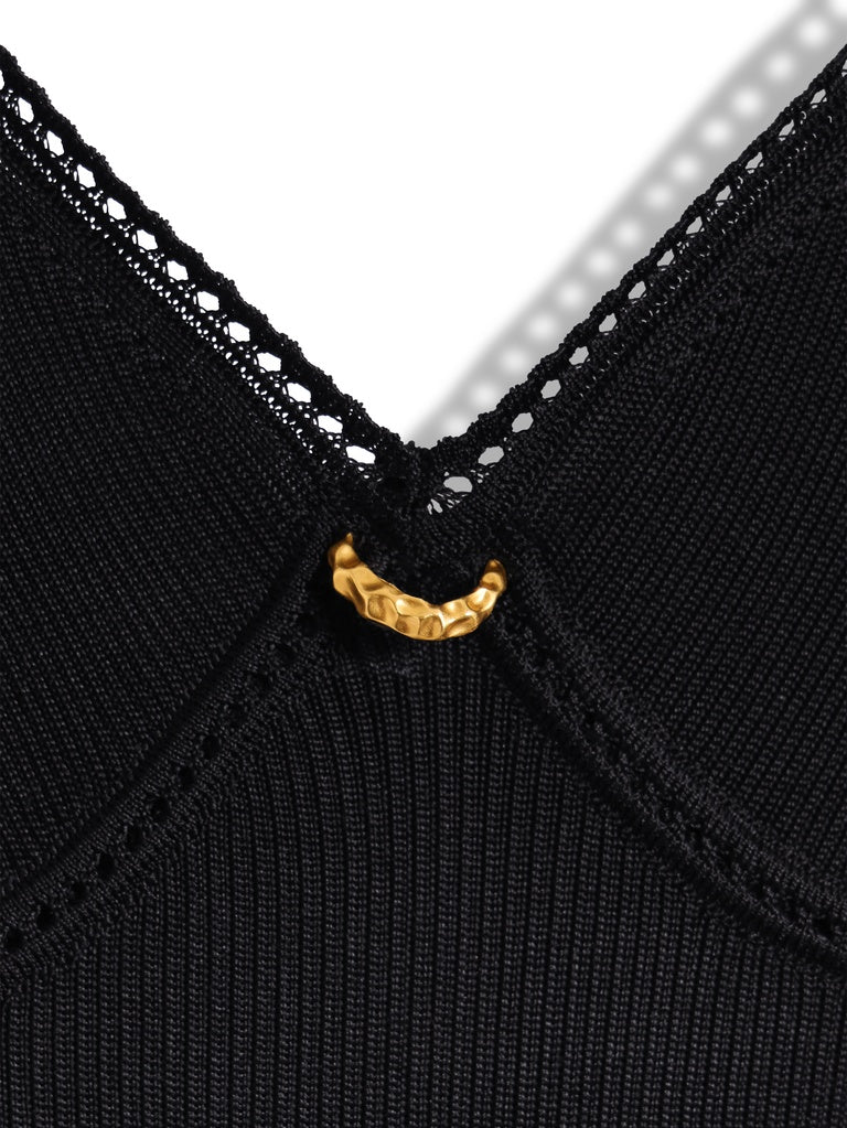 Caraco en soie noire à fines côtes rehaussé de détails de remaillage sous la poitrine, de détails lingerie au décolleté et sur les bretelles et d'un bijou piercing au niveau du décolleté.