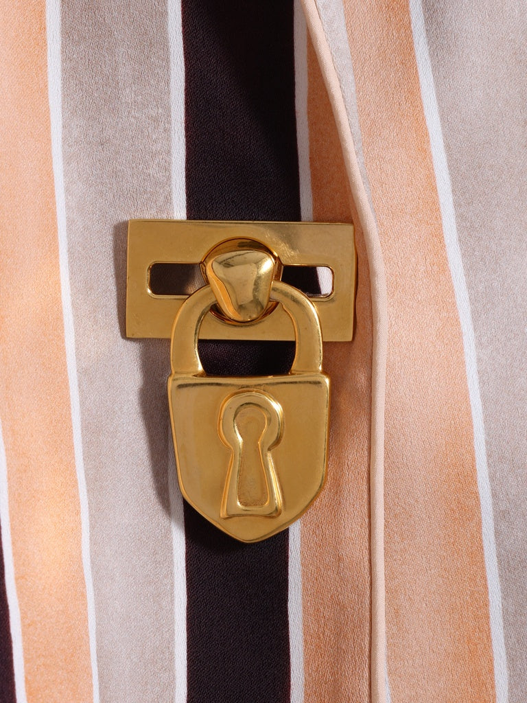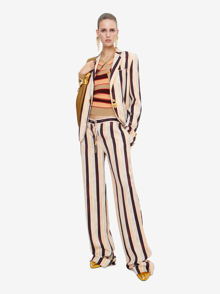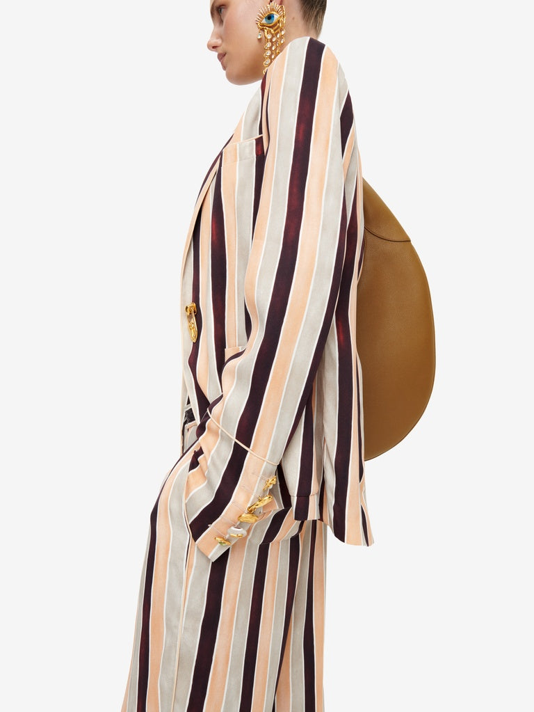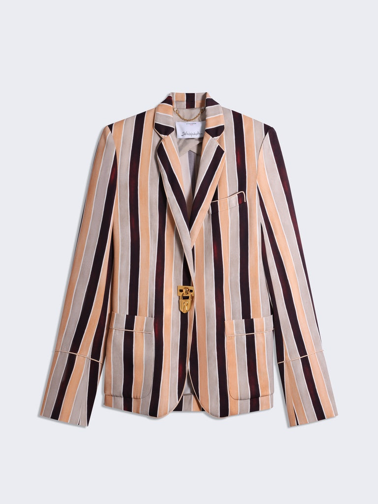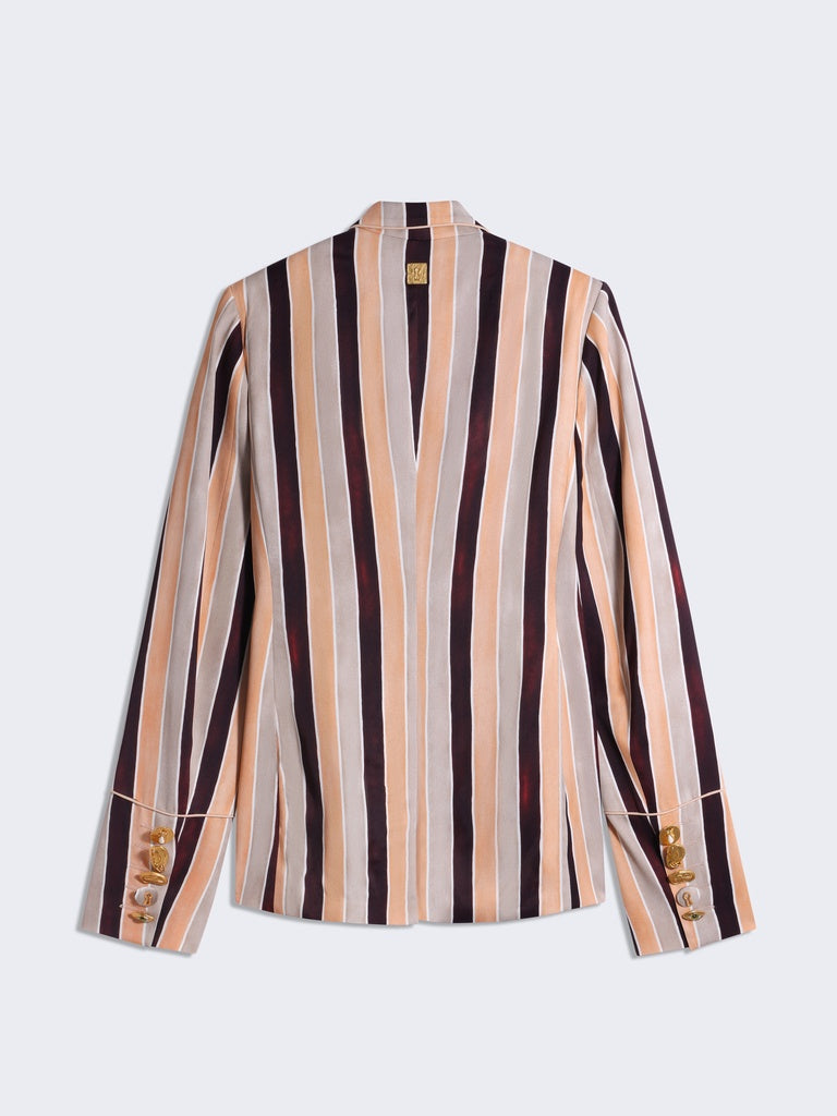 Veste de tailleur droite en satin rayé multicolore rehaussée de boutons bijoux dorés.