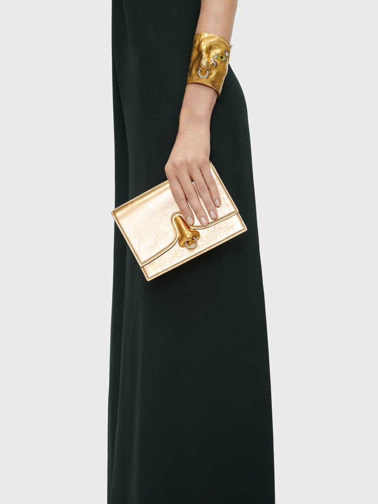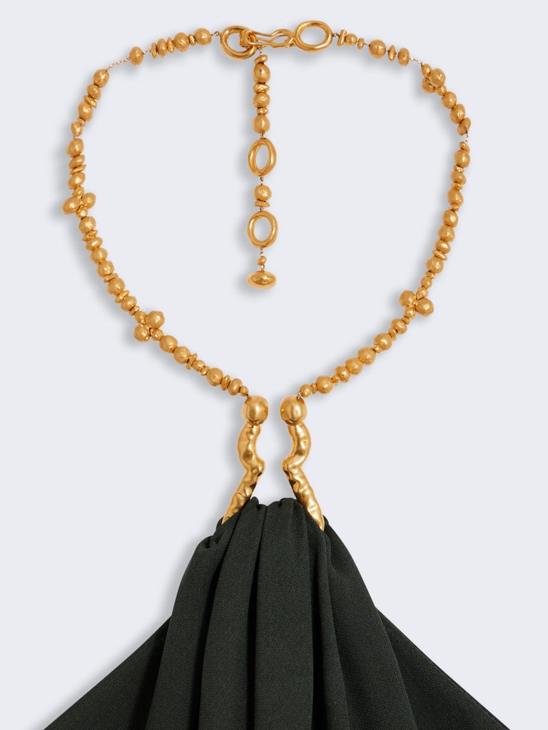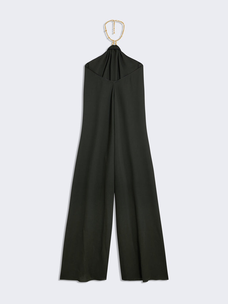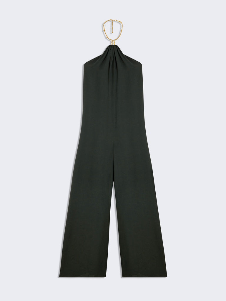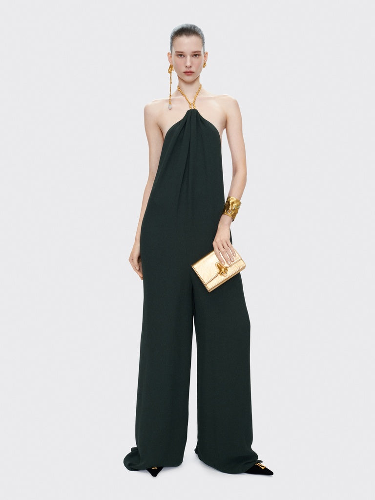 Cette combinaison dos nu à la jambe évasée et au tombé fluide est réalisée en crêpe vert foncé. Elle est retenue au niveau du cou par un collier bijou en laiton doré martelé.