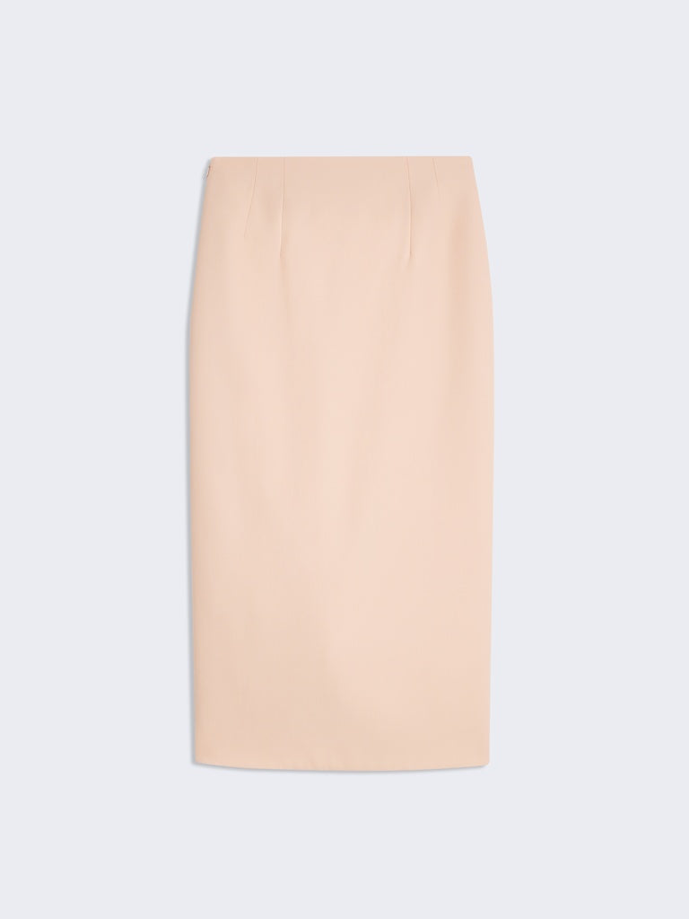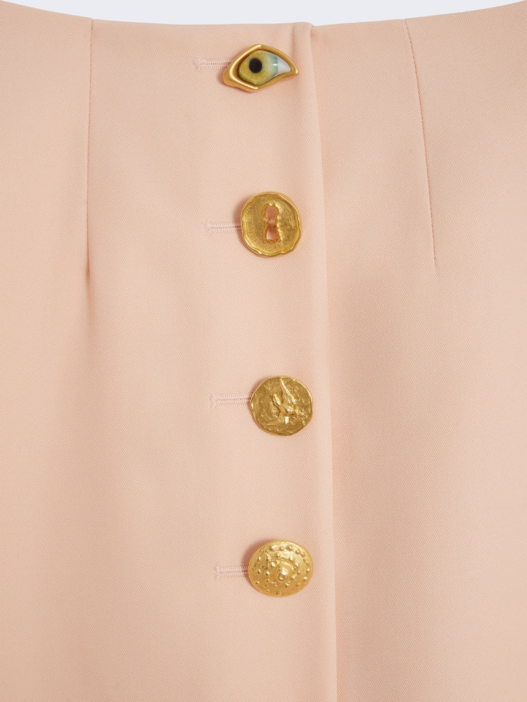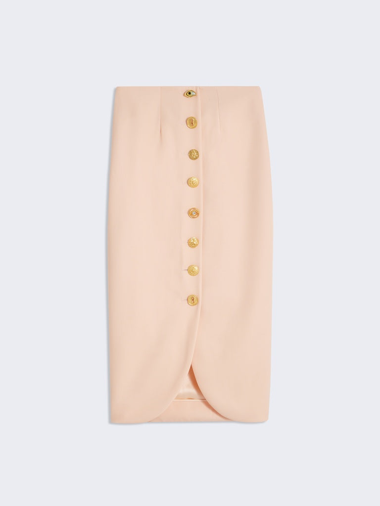 Cette jupe crayon longueur chevilles est réalisée dans un crêpe de laine rose pâle. Elle est ornée de boutons bijoux décoratifs en laiton doré martelé et légèrement ajourée sur le milieu devant.