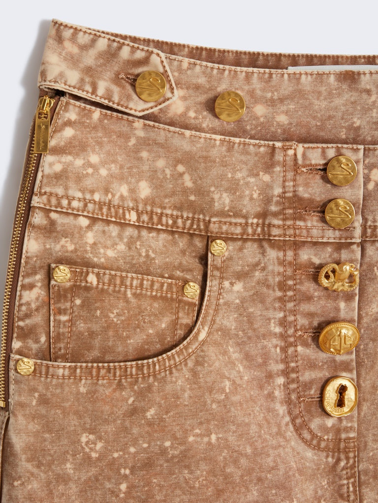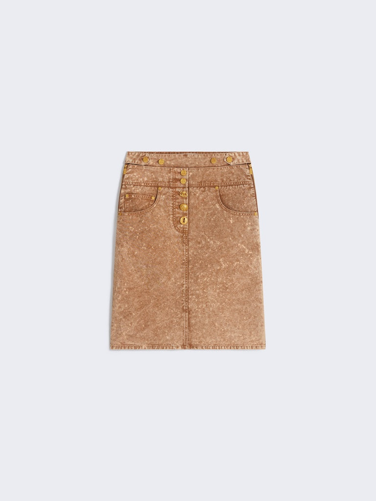 Cette jupe longueur midi est réalisée en coton parfait surteint et délavé en marron. Elle est décorée de boutons bijoux signature en laiton doré martelé, d'une petite Clé bijou décorative et de détails denim. Elle se ferme au dos.