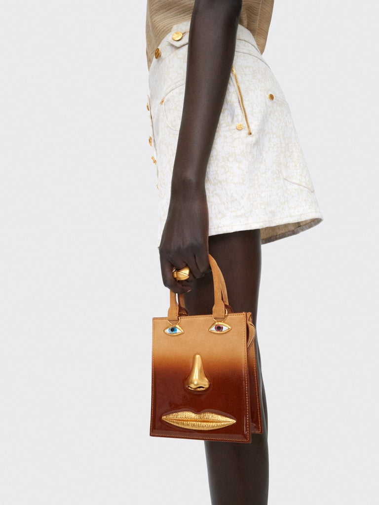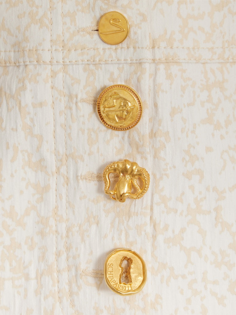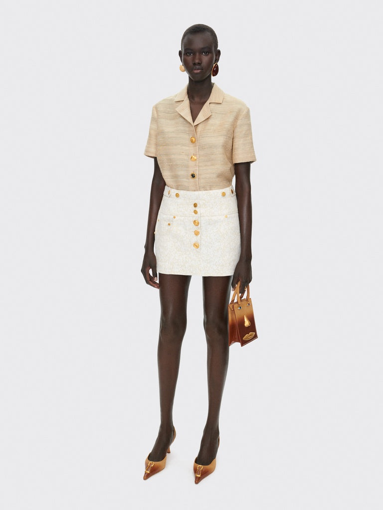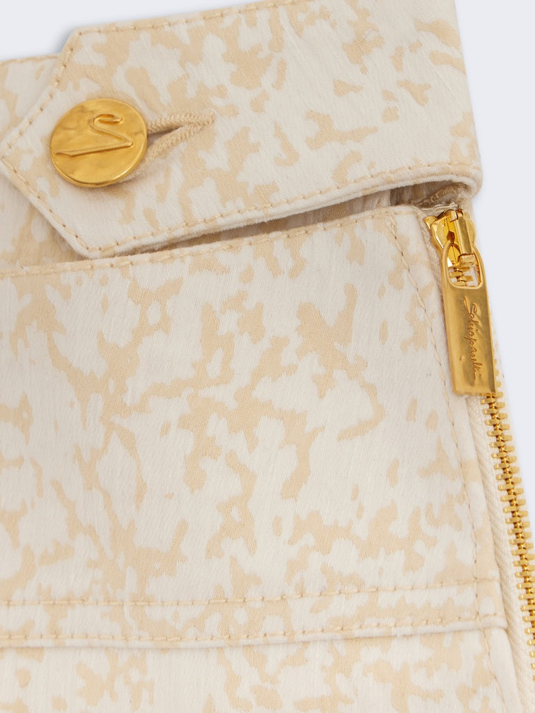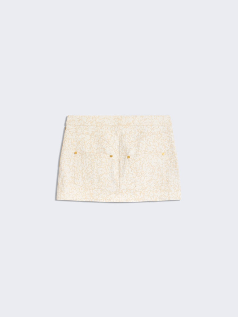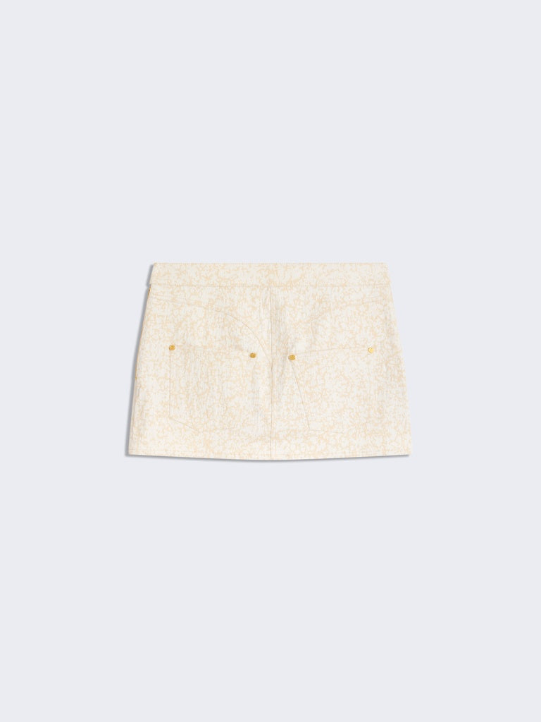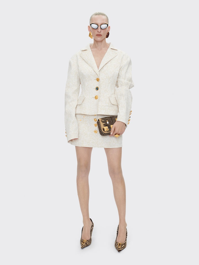 Cette minijupe en jacquard stretch écru effet délavé est rehaussée de nombreux détails denim caractéristiques de Schiaparelli : une ouverture à pont avec deux zip en métal doré sur les côtés, deux poches coutures devant et derrière, des détails de surpiqures ton sur ton, des boutons denim en hardware métallique et boutons bijoux en laiton doré martelé.