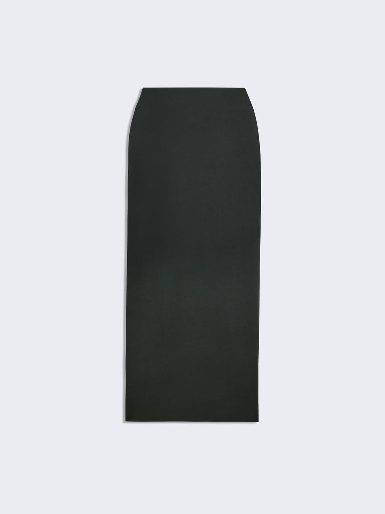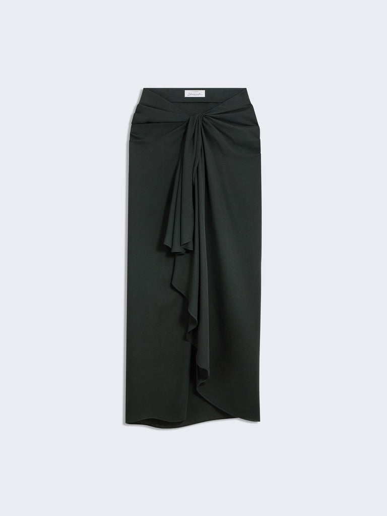 Cette jupe longue d'inspiration paréo est réalisée en crêpe vert focé. Elle est rehaussée d'un noeud décoratif ur le devant.