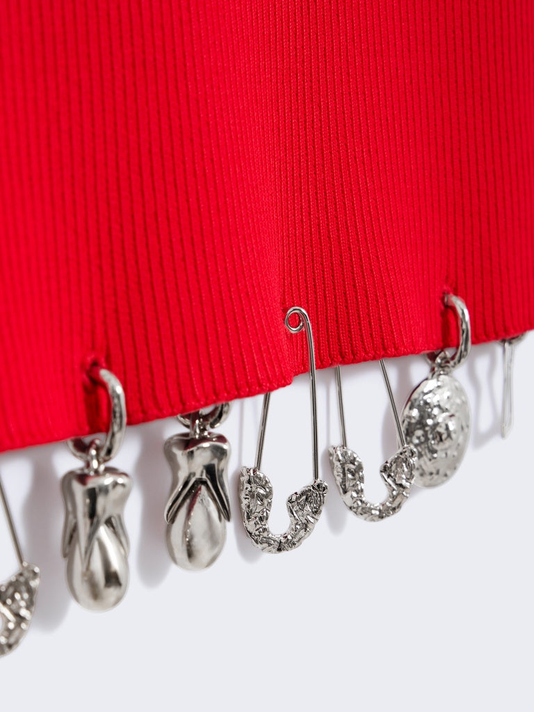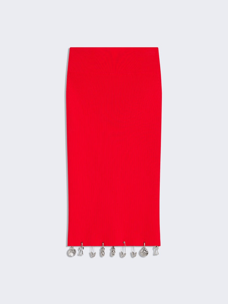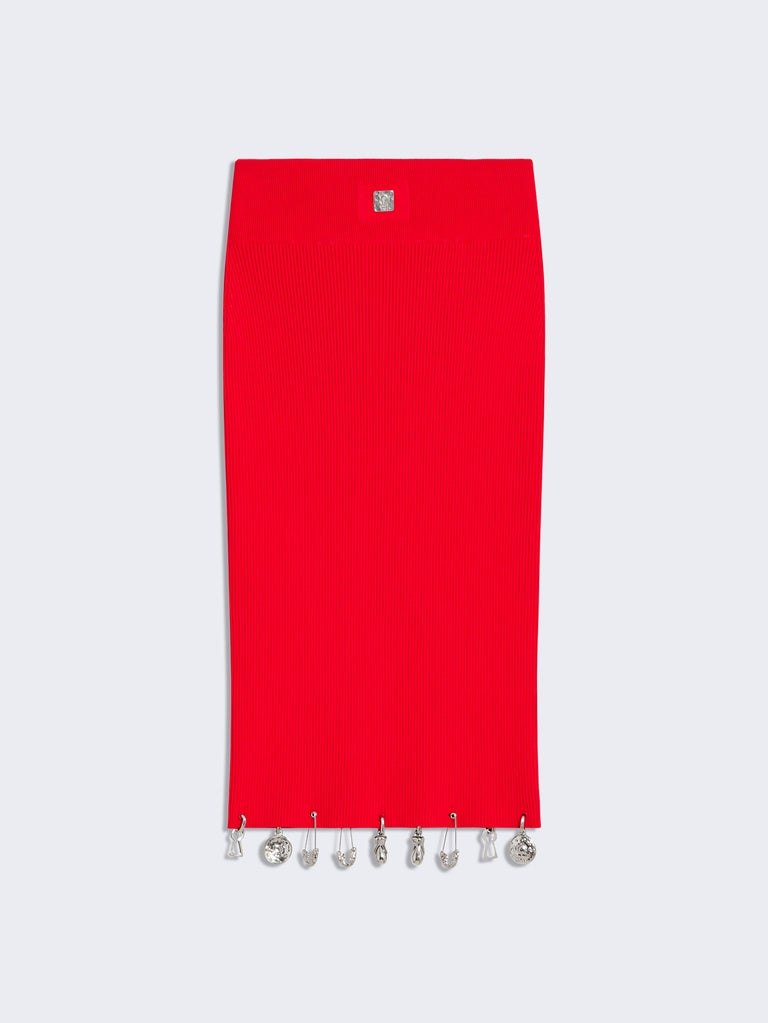 Cette jupe en maille fine rouge est agrémentée d'une fausse patte de boutonnage sur le devant, de bijoux anatomiques Schiaparelli signature argentés à l'ourlet et d'un rivet Trou de Serrure signature au dos.