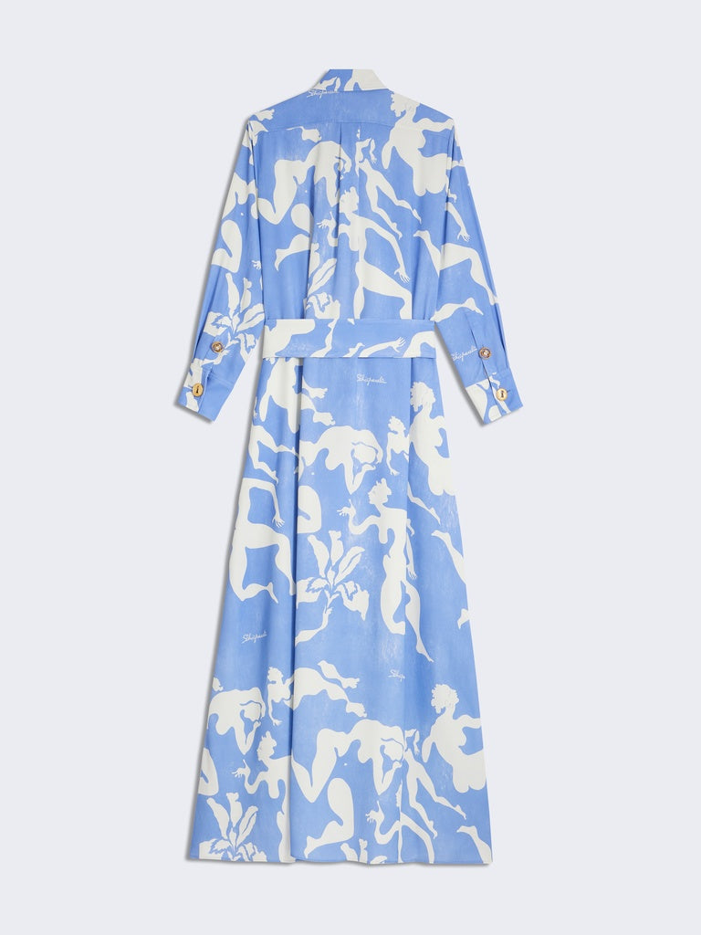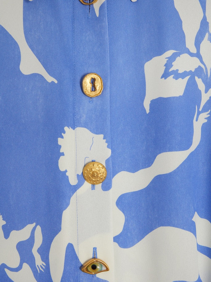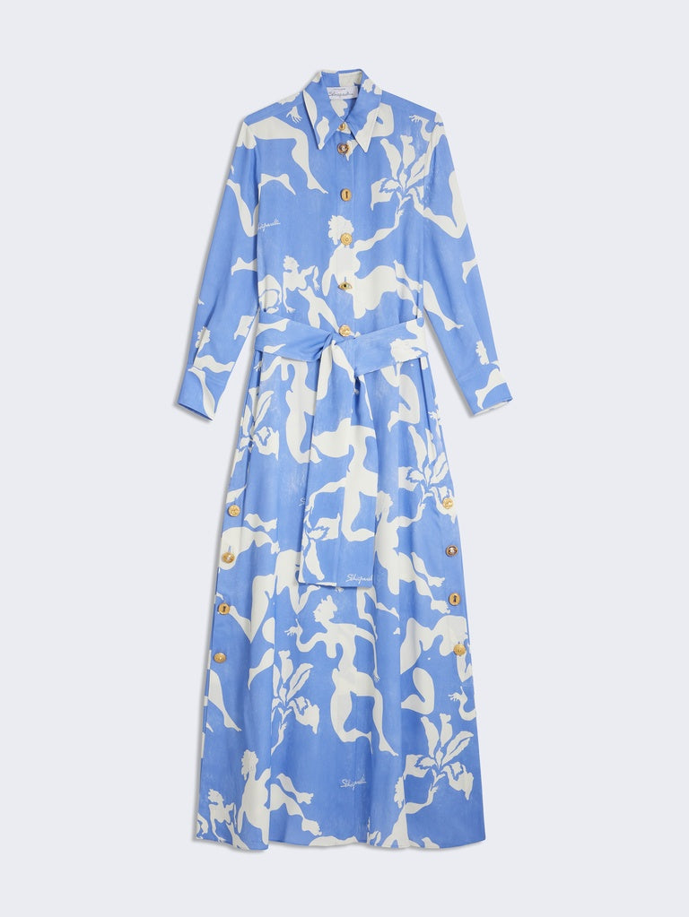 Cette robe chemise est réalisée en viscose bleue imprimée de dessins originaux de Daniel Roseberry en blanc. Elle est réhaussée de boutons bijoux au milieu devant, sur les fentes côtés et les poignets.