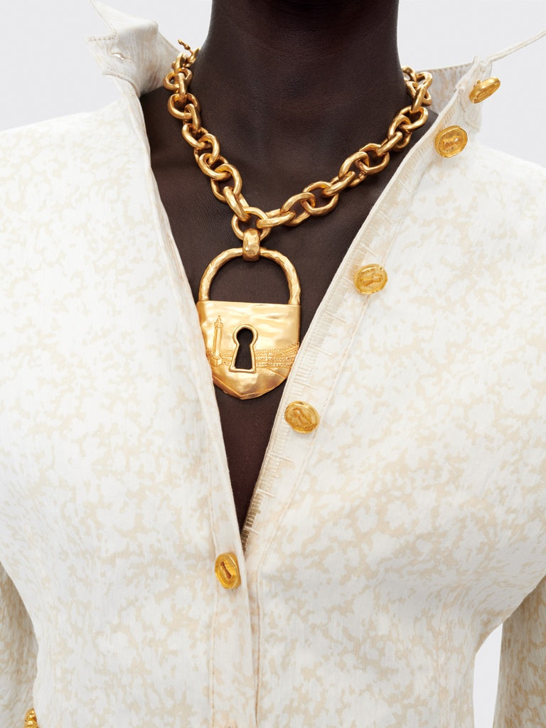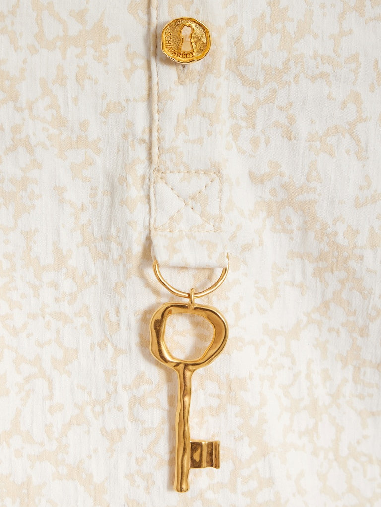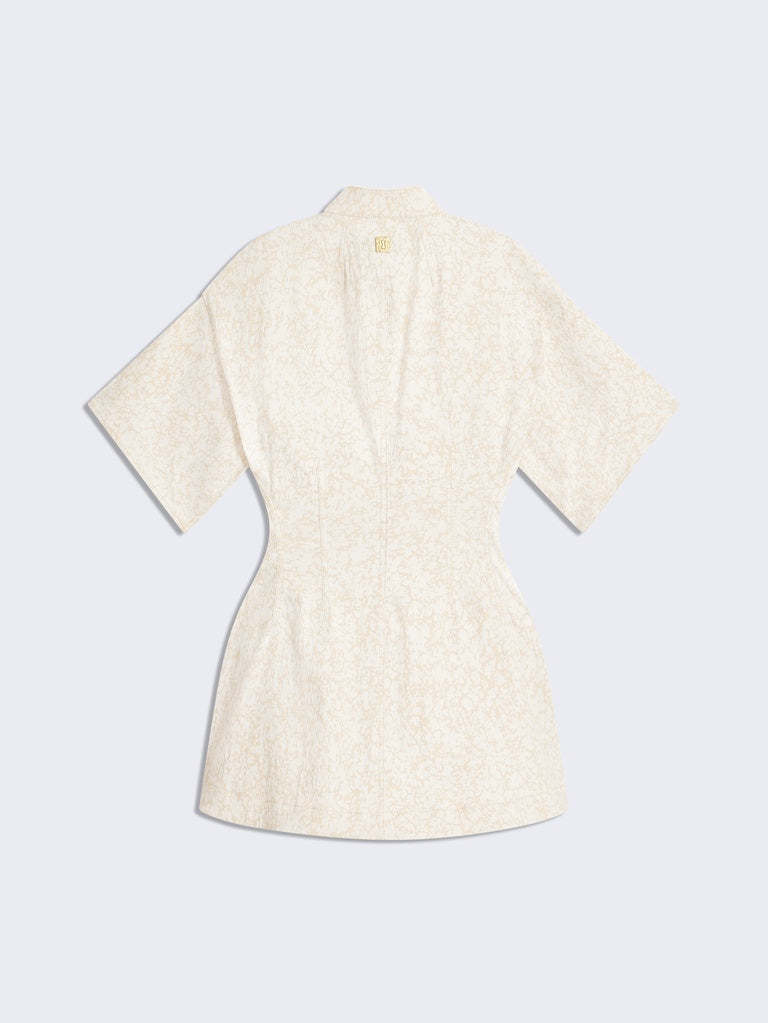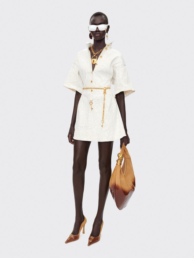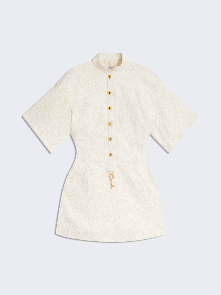 Cette mini robe est réalisée en tissu stretch écru rehaussé d'un jacquard effet délavé. Elle est rehaussée d'un décolleté vertigineux et d'une Clé bijou décorative en métal doré sur le devant, et d'une broderie Mètre Ruban signature en fil doré le long de l'encolure au côté gauche.