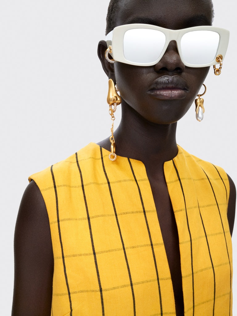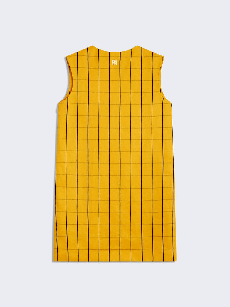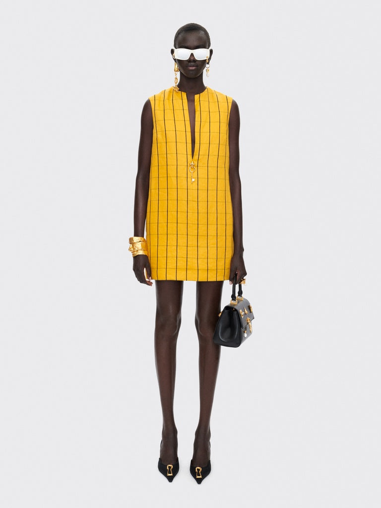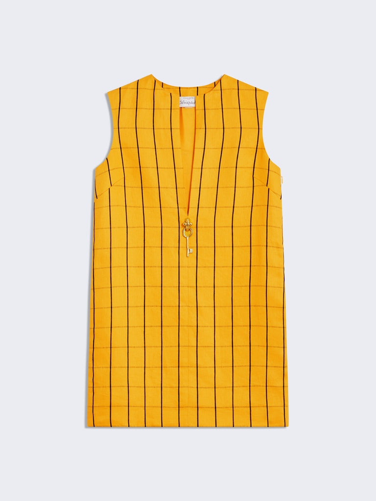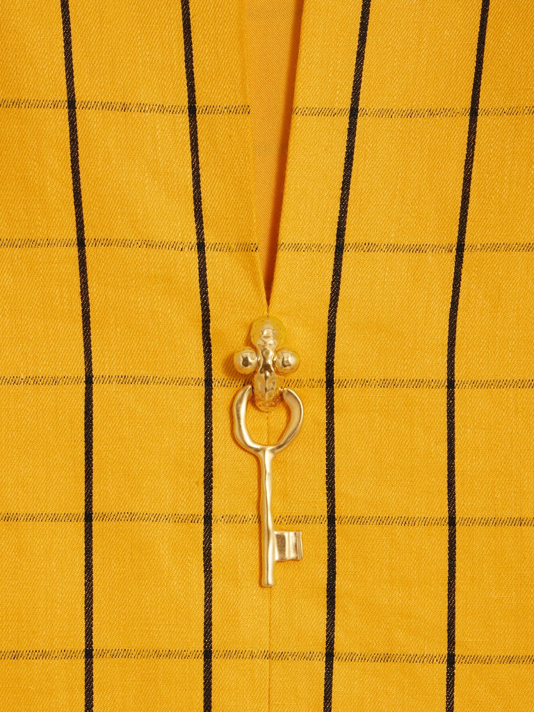 Cette robe courte sans manches a été réalisée en lin texturé jaune à carreaux noirs. Elle est fendue sur le devant et ornée d'une Clé bijou décorative en laiton doré.