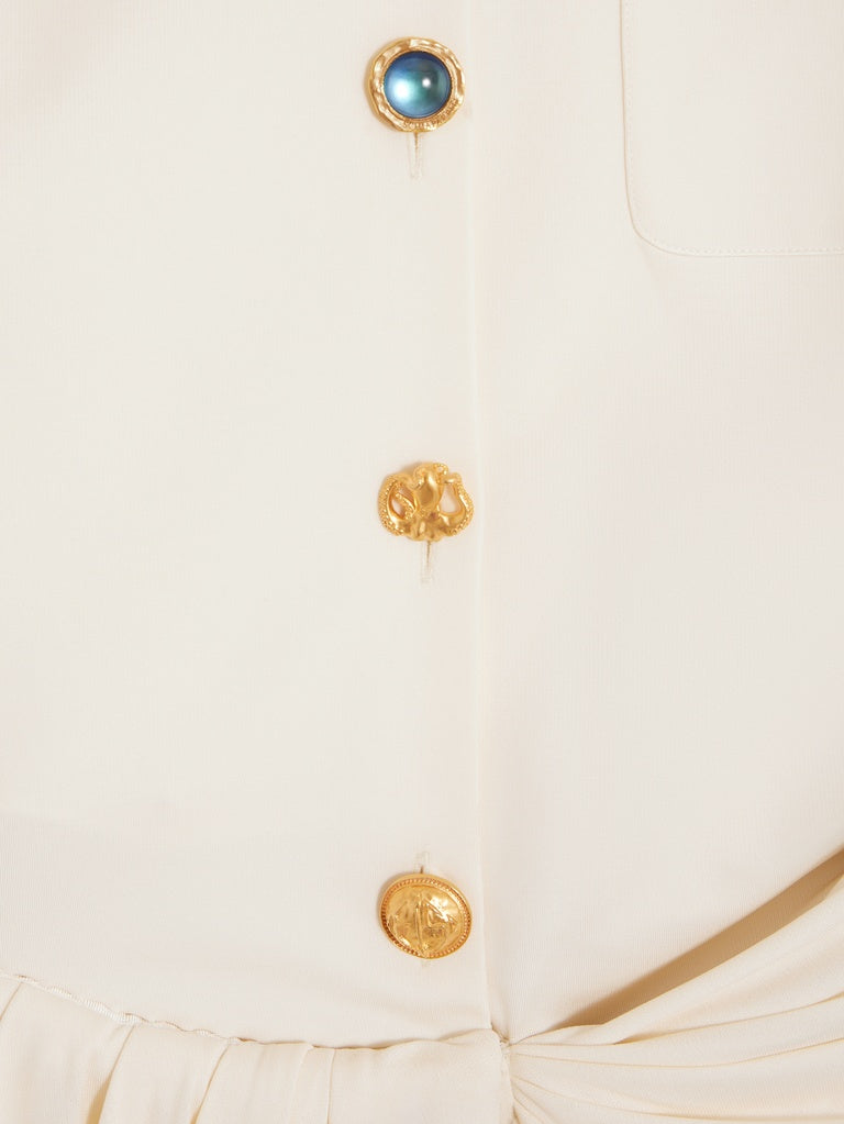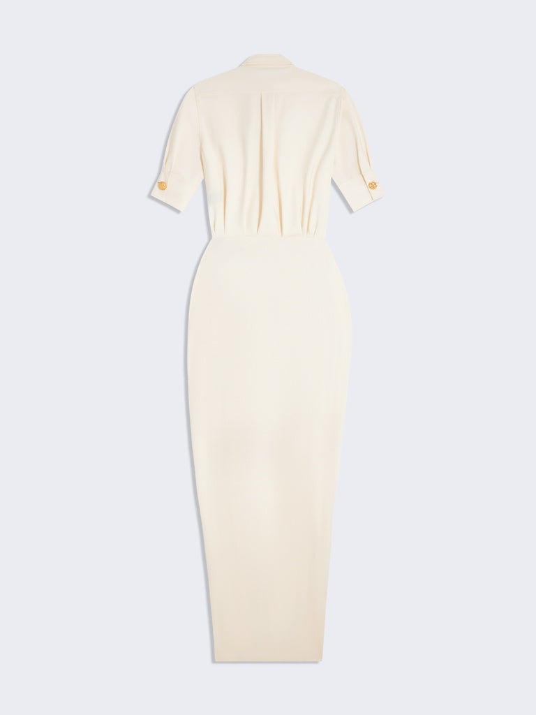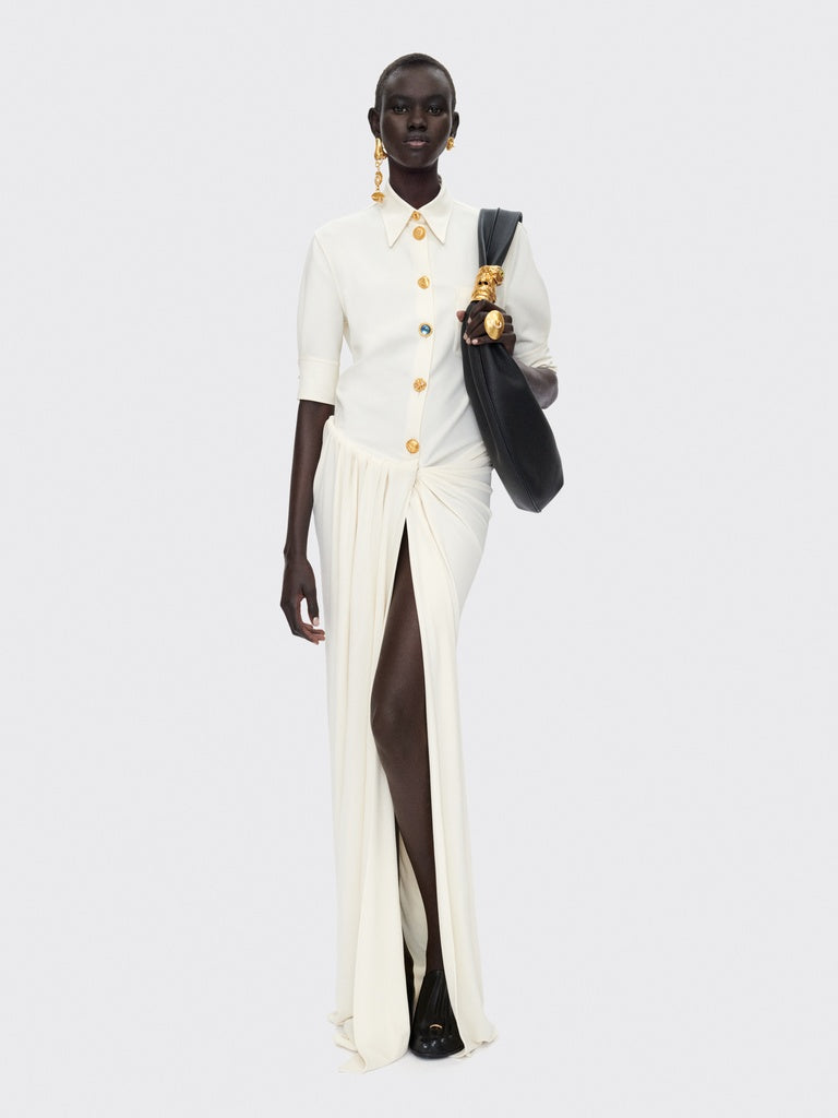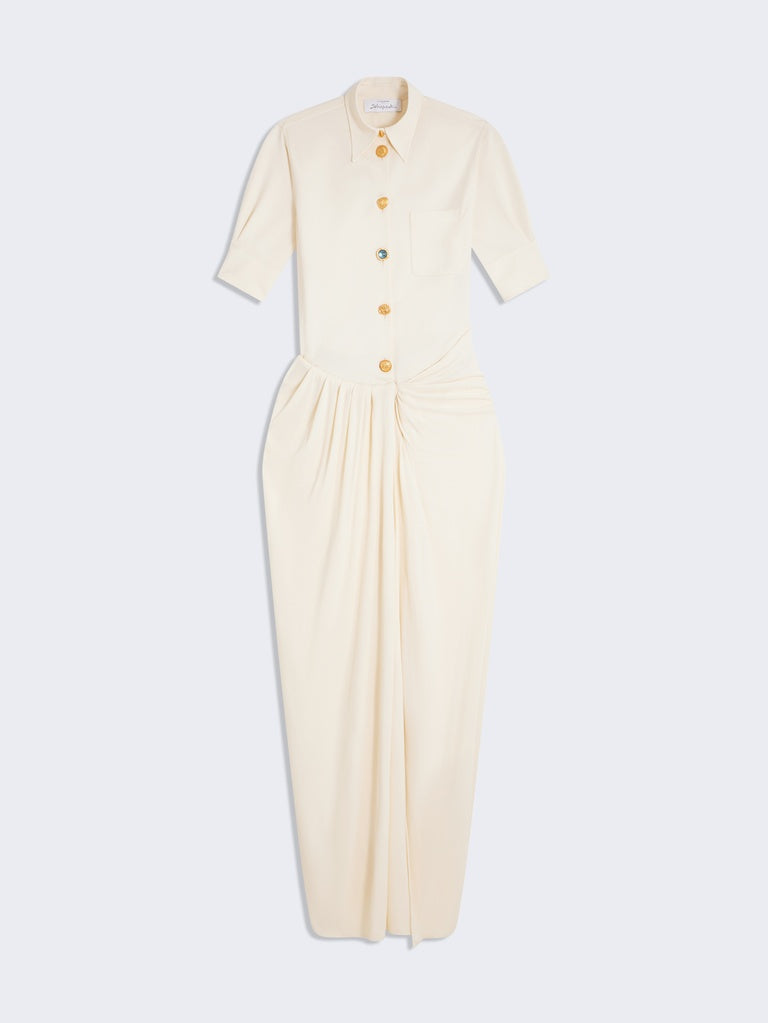 Cette robe chemise est composée d'une chemise à manches courtes en jersey compact écru ornée de boutons bijoux en métal doré sur la partie haute et d'une jupe longue drapée d'inspiration paréo en crêpe jersey écru ton sur ton sur la partie basse.