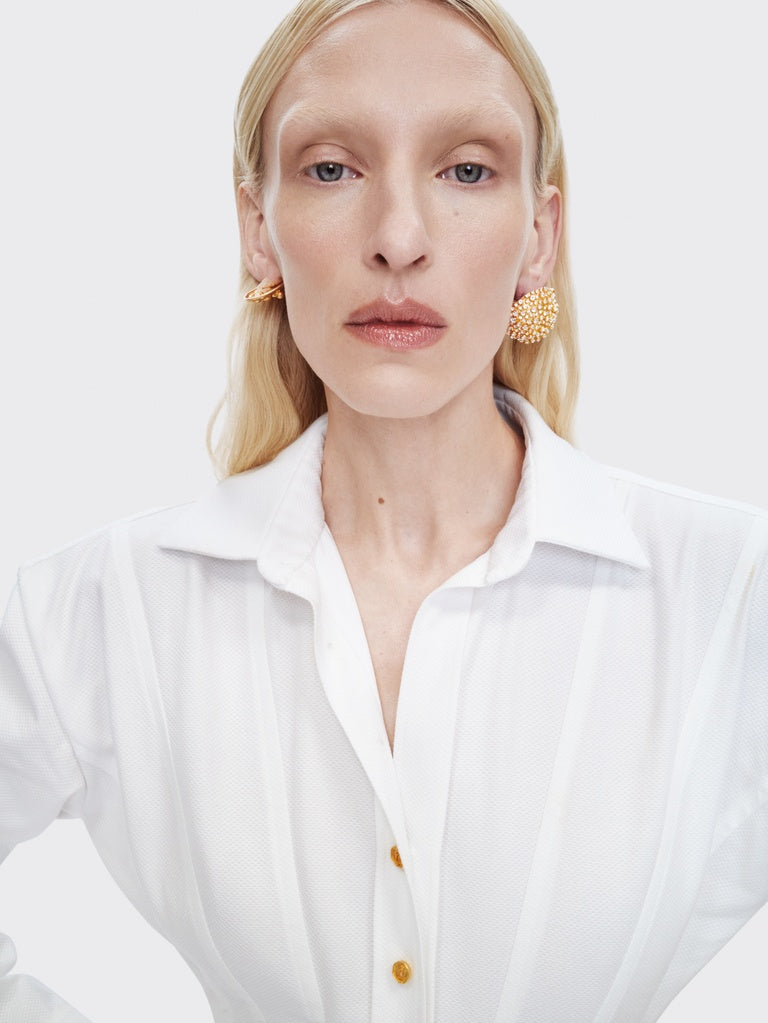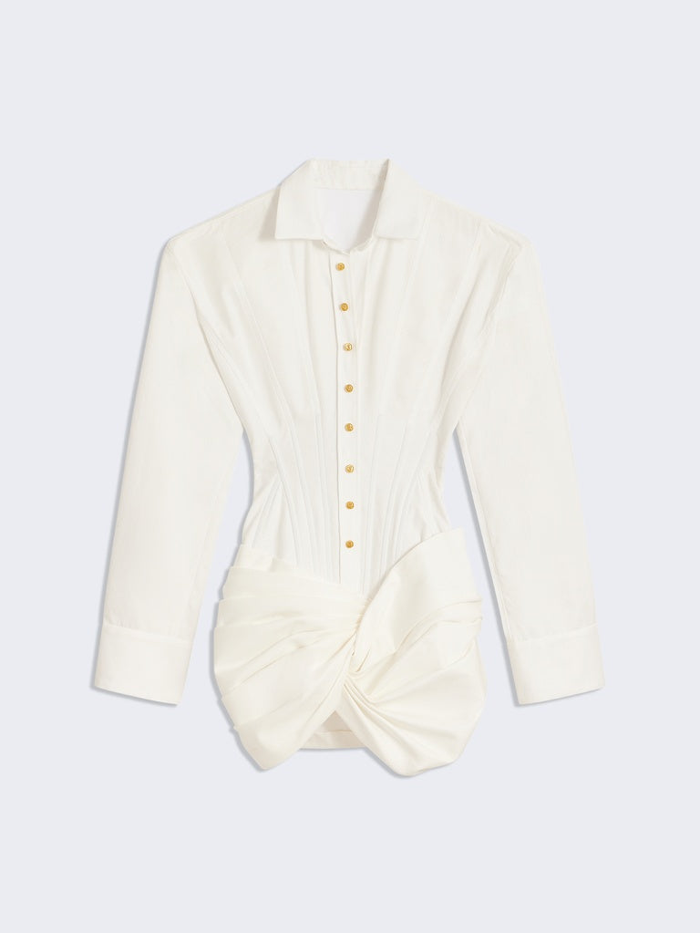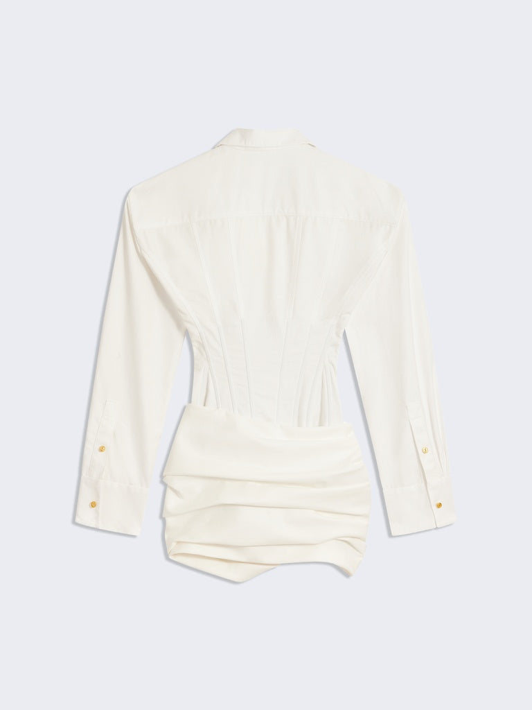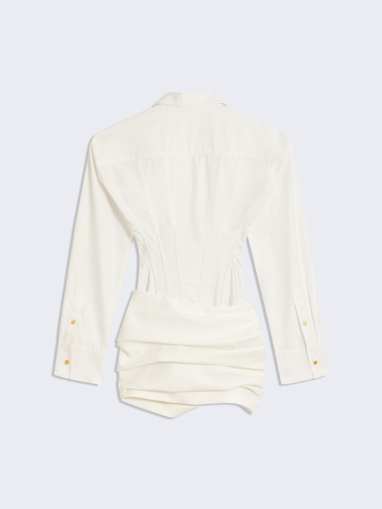 Cette mini robe chemise à manches longues est réalisée en piqué de coton blanc. Elle est construite comme une chemise corsetée rehaussée de détails de surpiqures ton sur ton sur le haut et comme une minijupe paréo nouée sur le bas. Elle est dotée d'un zip invisible sur le côté.