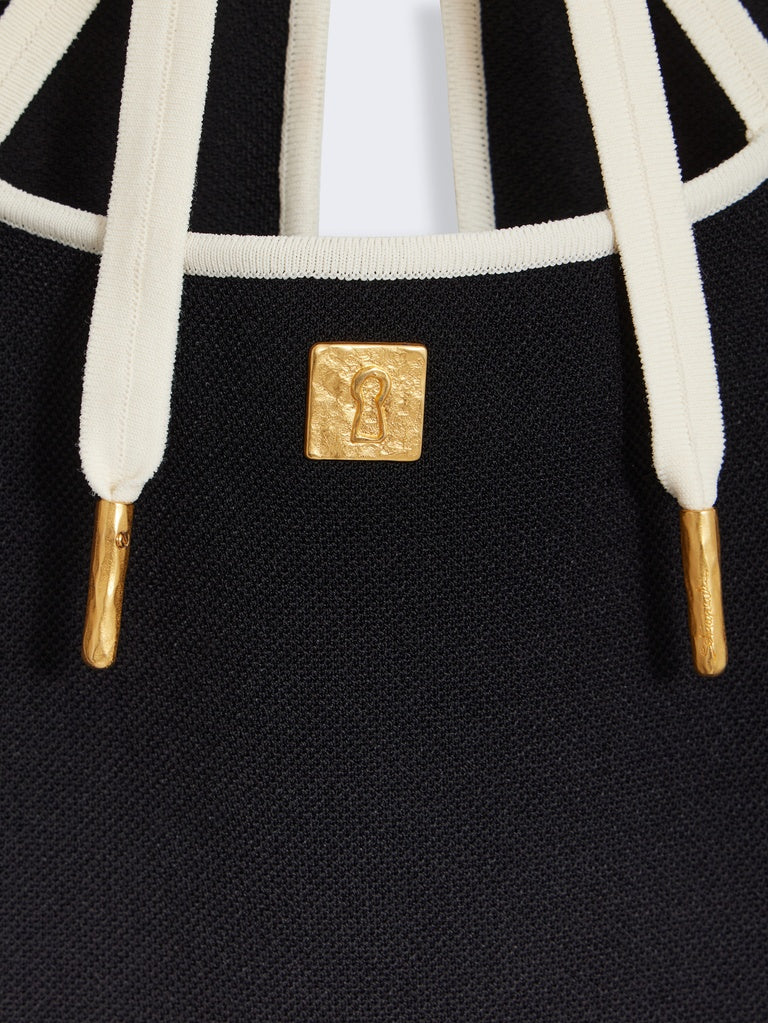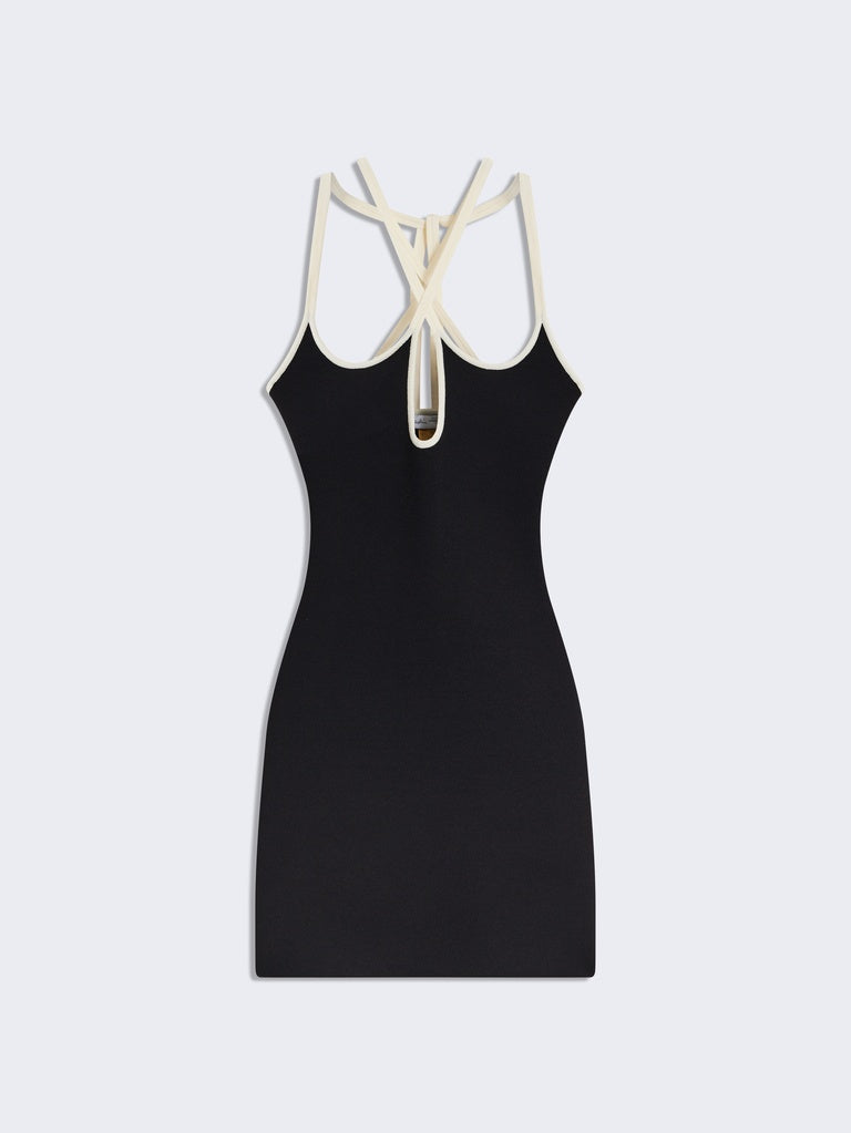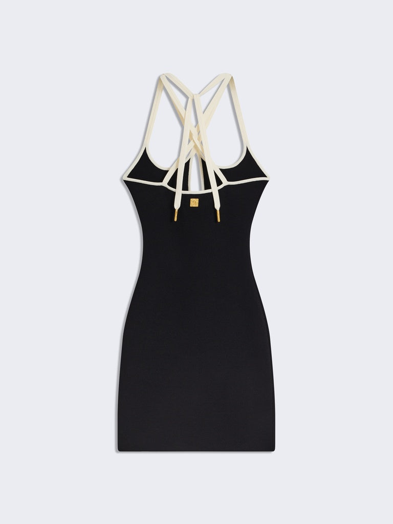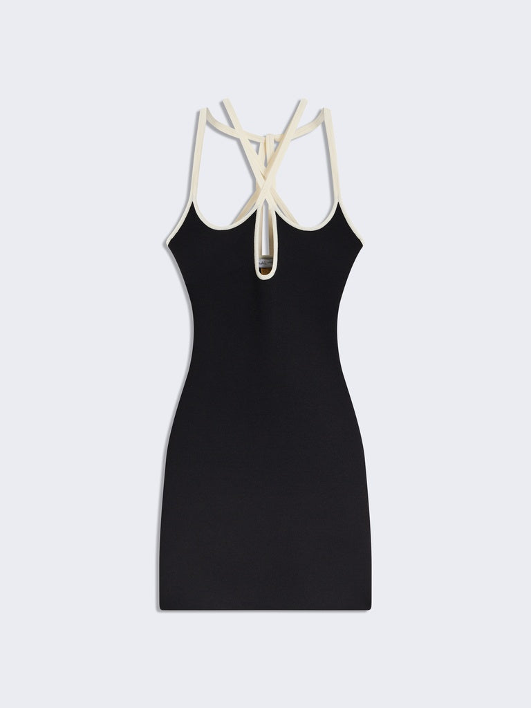 Cette robe crayon courte a été réalisée en maille viscose piquée noire. Elle est rehaussée de doubles bretelles écrues contrastées dessinant une gouttes sur le devant et surmontées d'embouts Trou de Serrure signature.