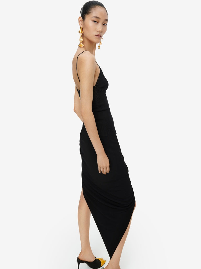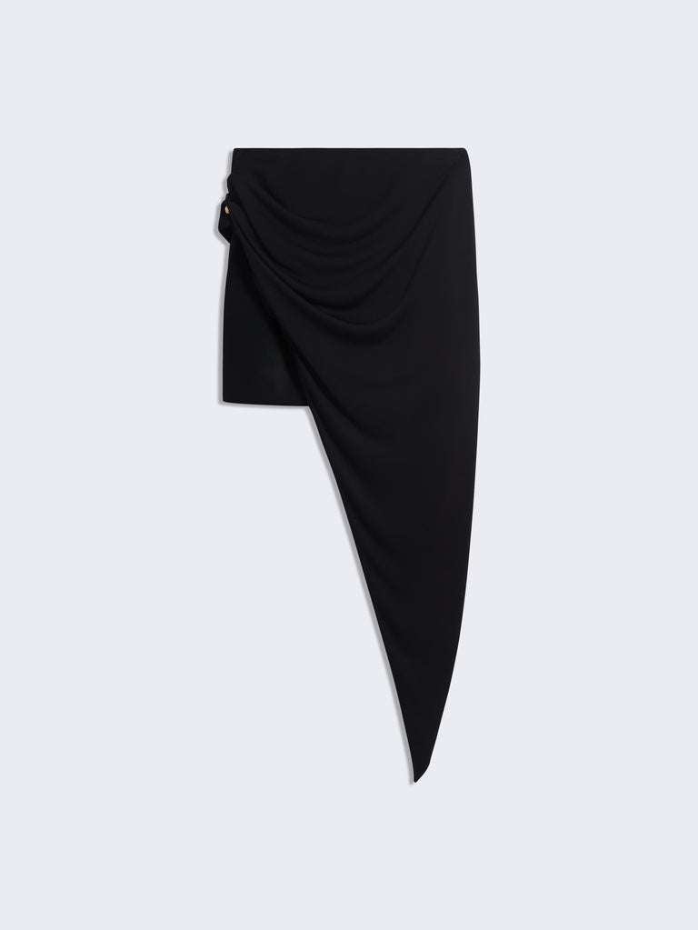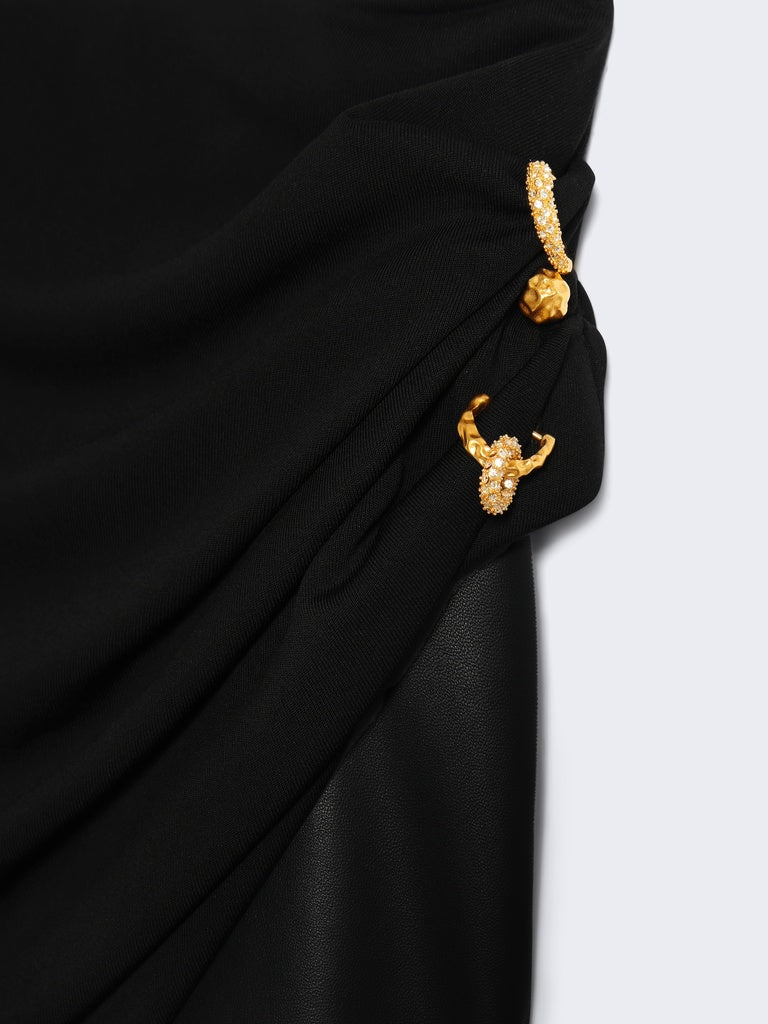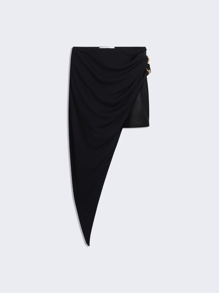Jupe asymétrique en jersey fluide noir au volume ramassé sur le côté gauche rehaussée de piercings laissant apparaitre une mini-jupe en cuir noir ton sur ton en dessous.
