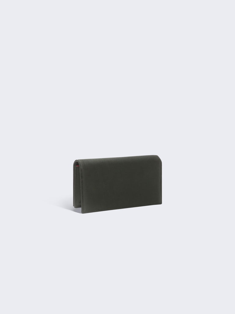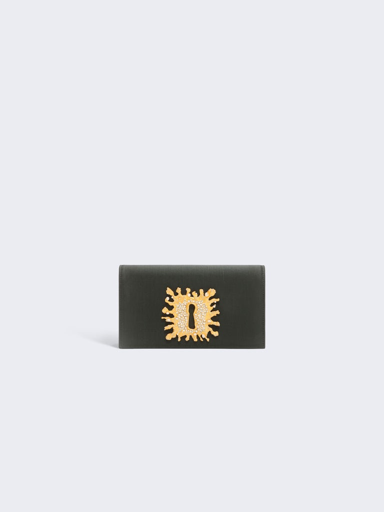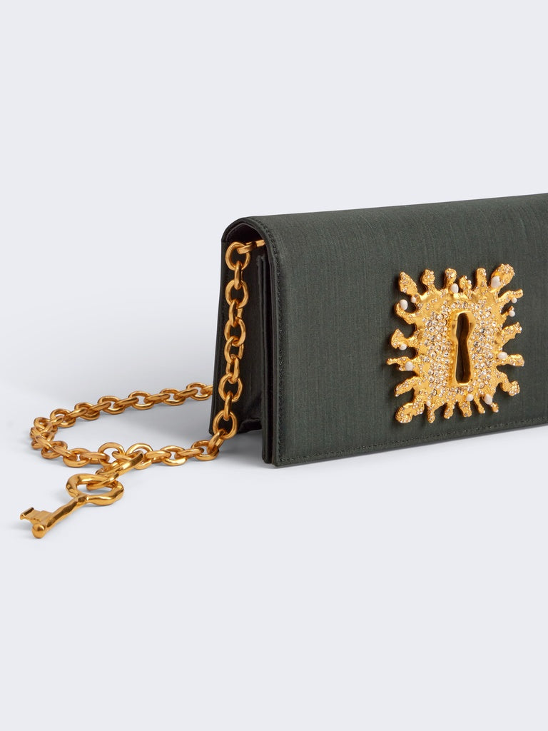 Cette pochette à rabat simple a été réalisée dans un satin vert foncé, intérieur cuir d'agenau. Elle est décorée d'une plaque bijou Trou de Serrure signature en laiton et strass et d'une chaîne à maillons en métal doré assortie.