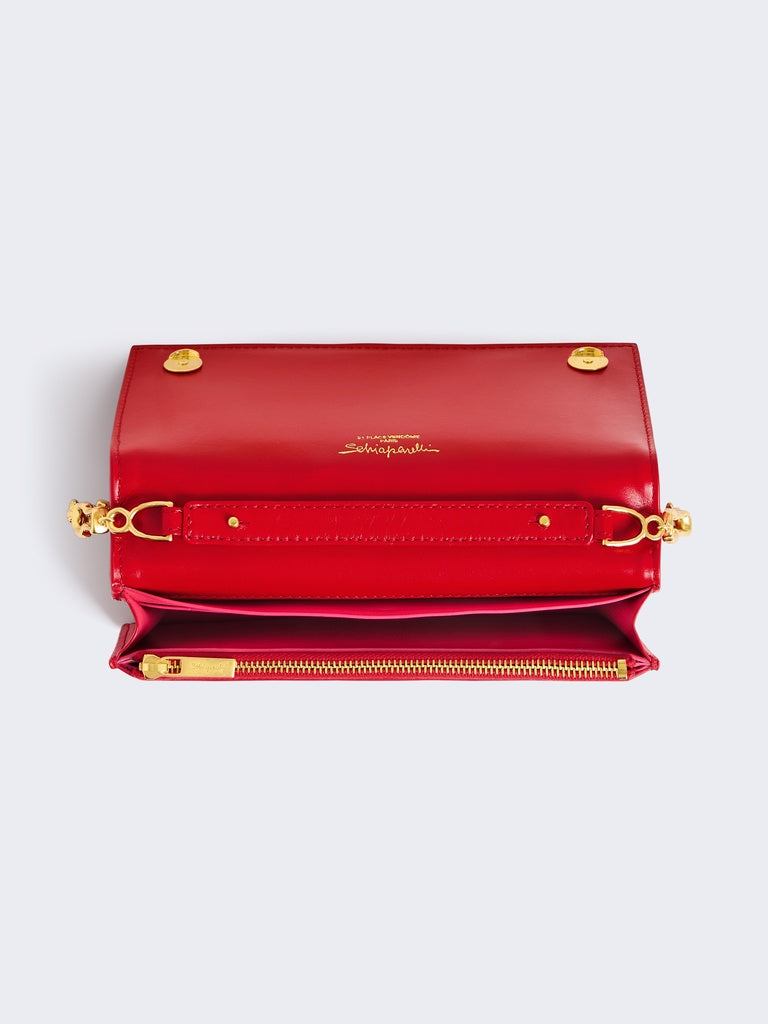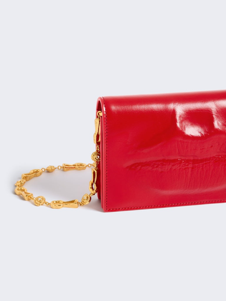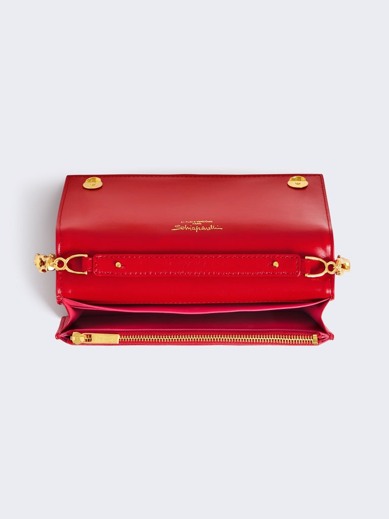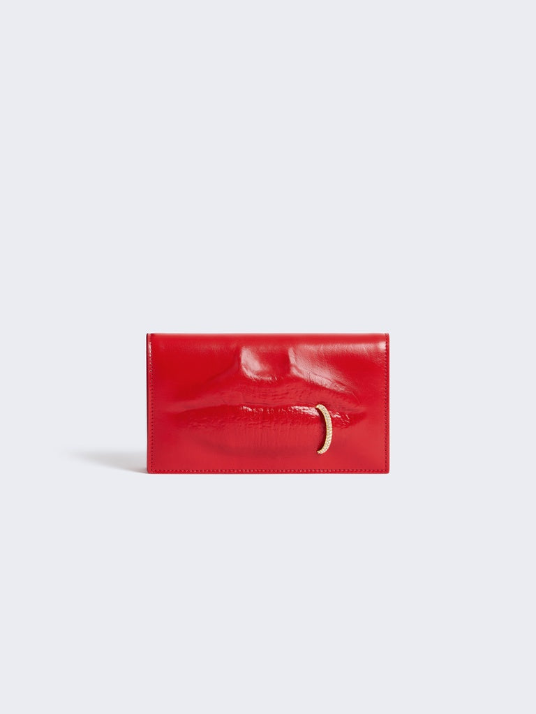 Cette pochette en cuir rouge doublée en cuir d'agneau est incrustée d'une Bouche moulée signature ornée de piercings à strass et rehaussée d'une chaîne signature en métal doré dont les maillons sont en forme de Trou de Serrure.