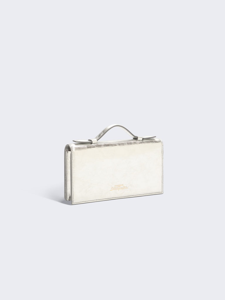 Cette pochette en cuir de veau froissé laminé argenté réhaussée d'une plaque Trou de Serrure signature en laiton et d'une chaîne à maillons en métal doré rend hommage à l'un des codes phares de la Maison.