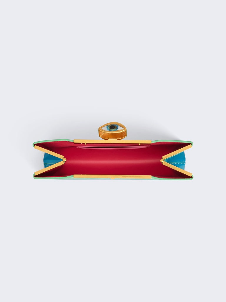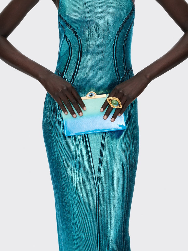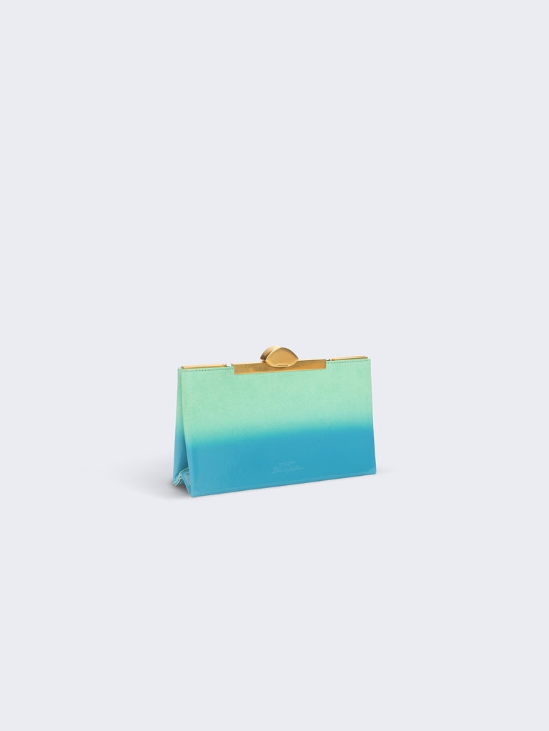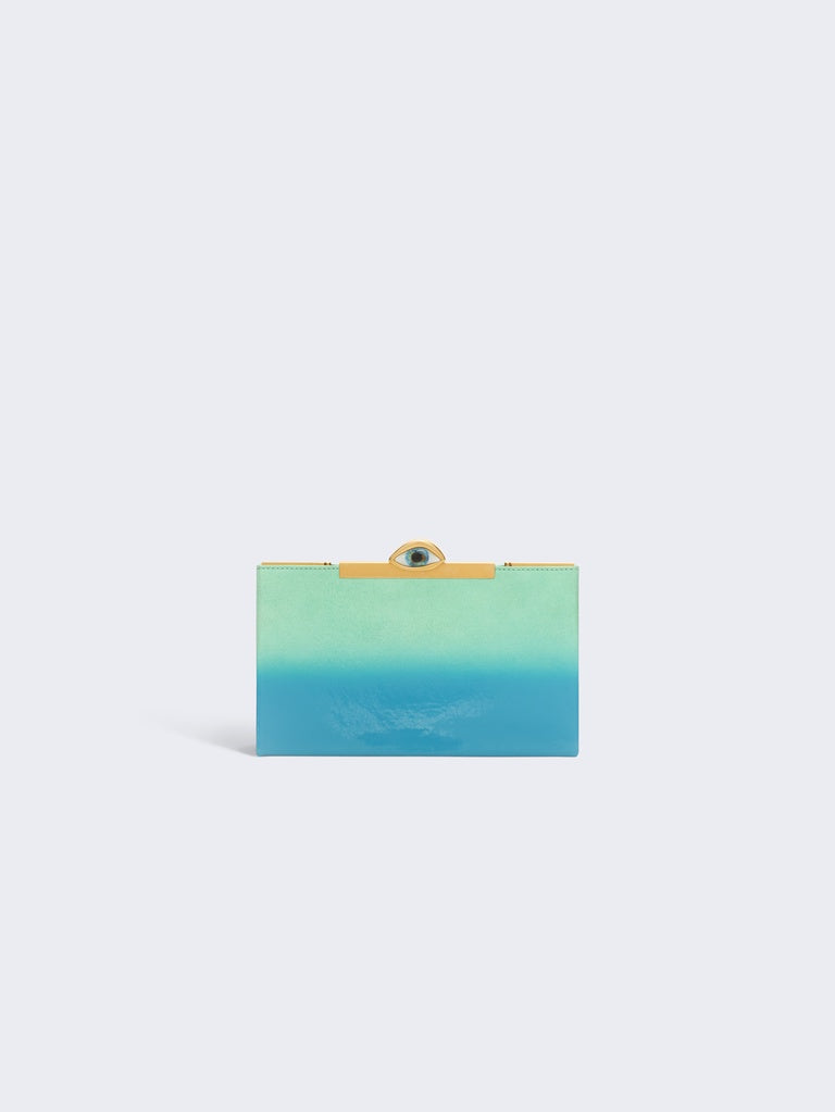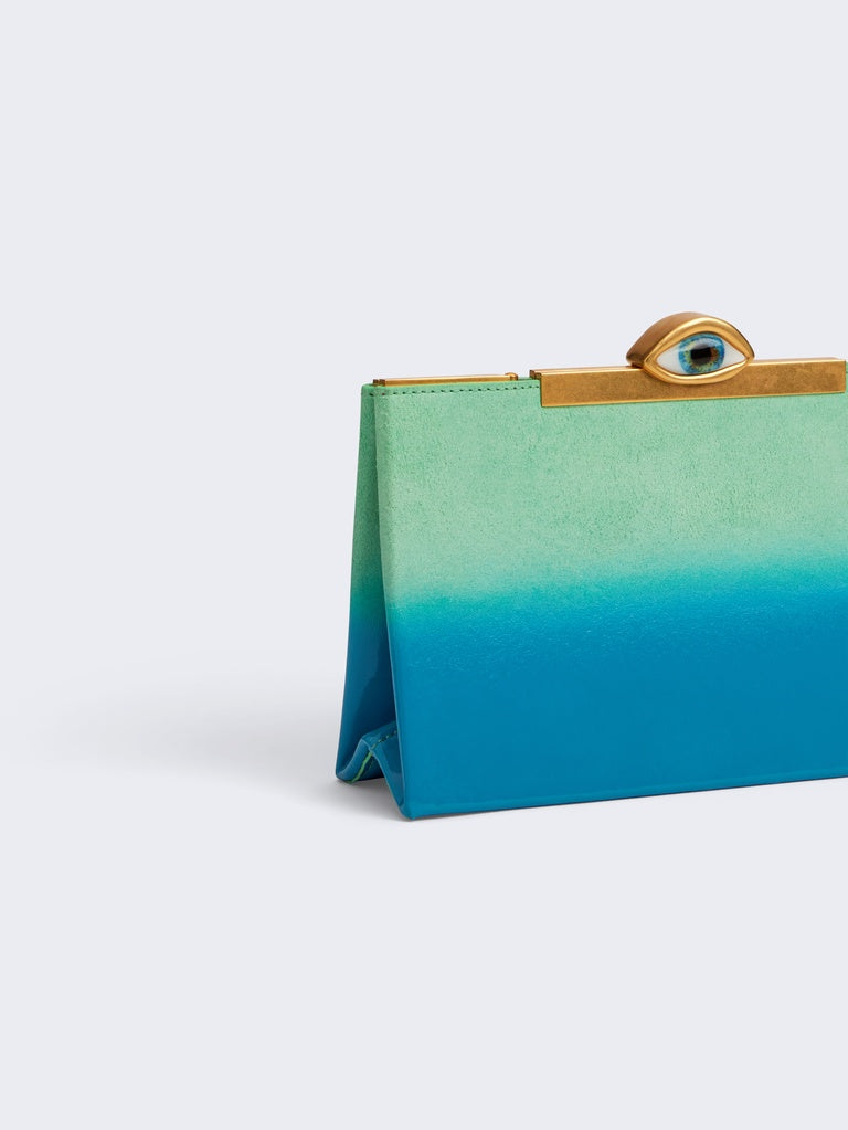 Cette pochette en suede turquoise et intérieur cuir d'agneau a été painte à la main au spray pour créer cet effet dégradé brillant. Elle est ornée d'une fermeture metallique surmontée d'un Oeil signature en émail et strass.