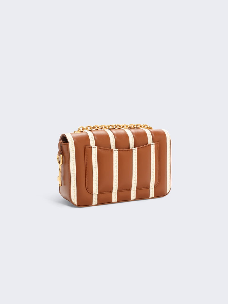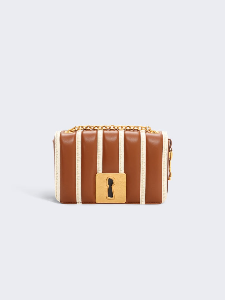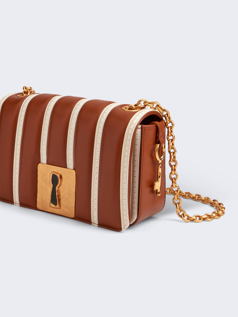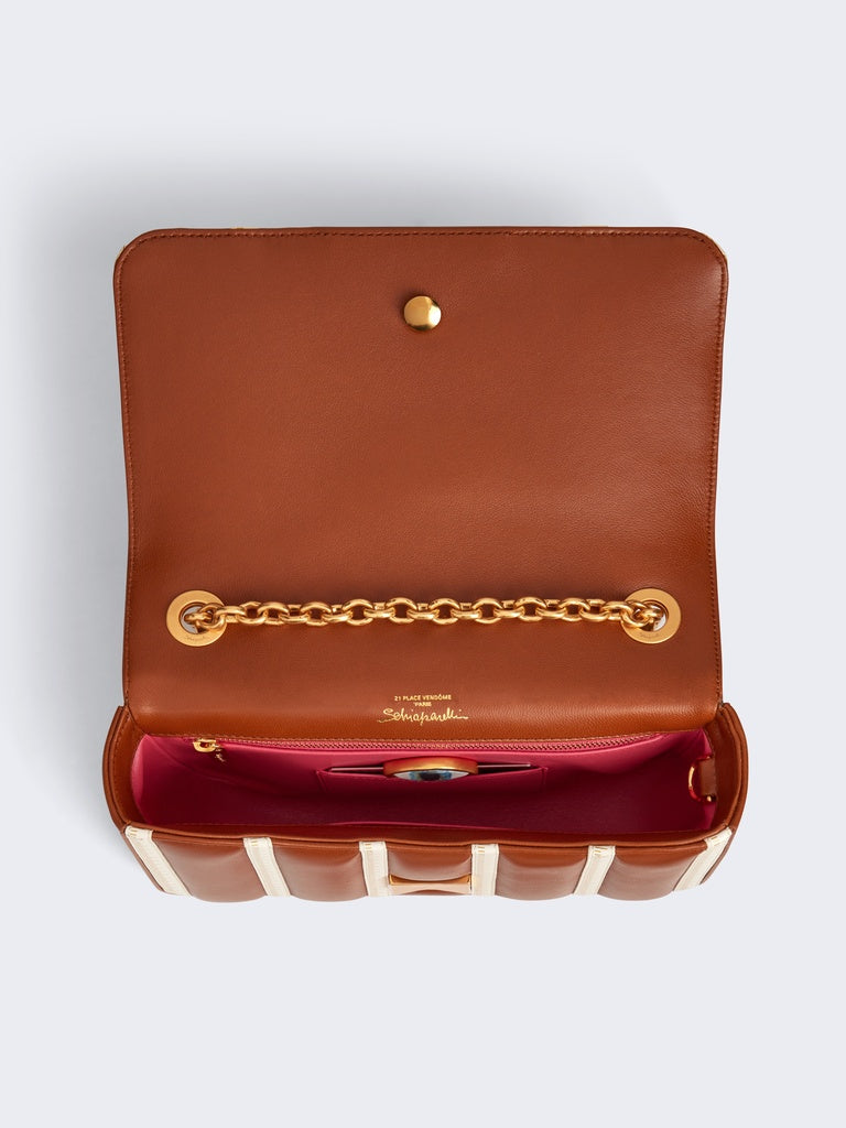 Ce sac Schiap est confectionné dans un cuir trapunto contrasté camel et écru embossé du motif Mètre Ruban signature et orné d’une plaque Trou de Serrure signature, d'une chaîne à maillons et d'un bijou Clé doré sur le côté.