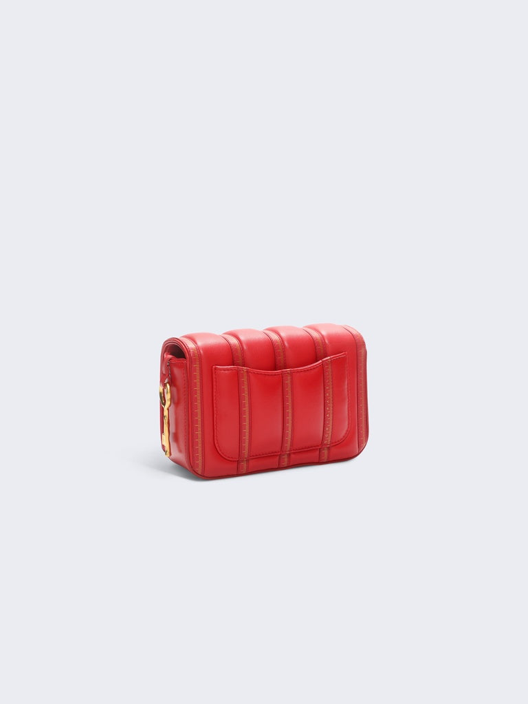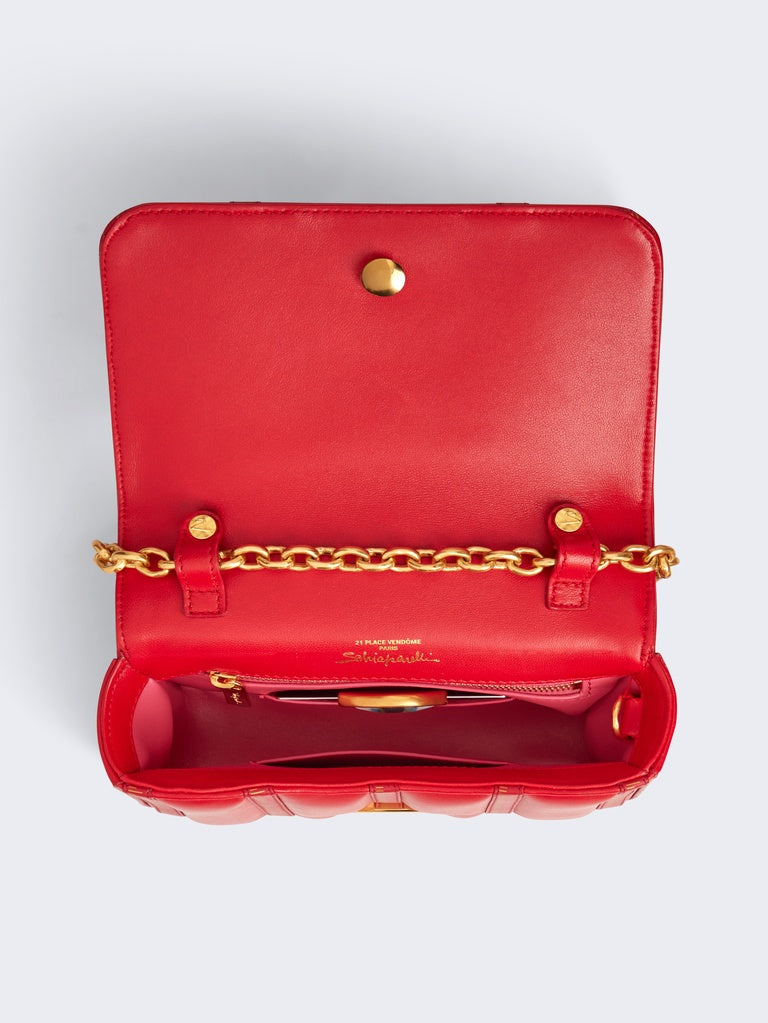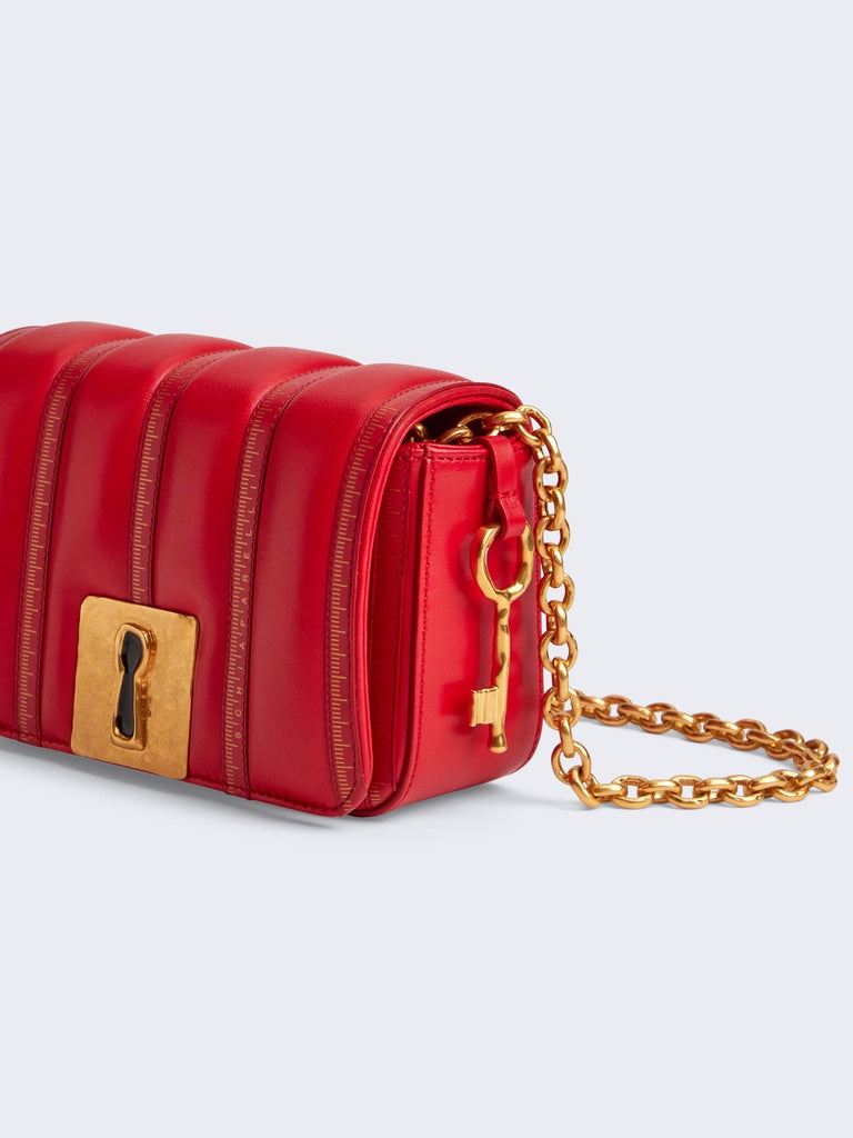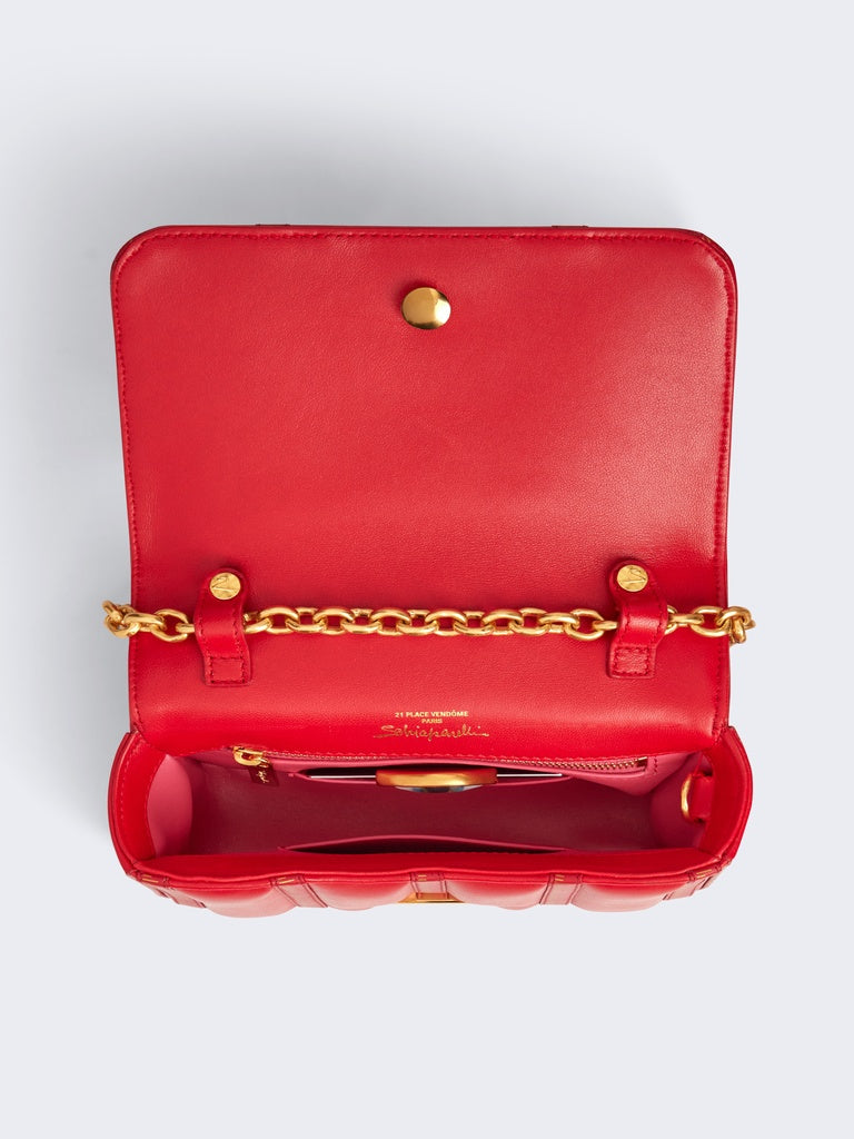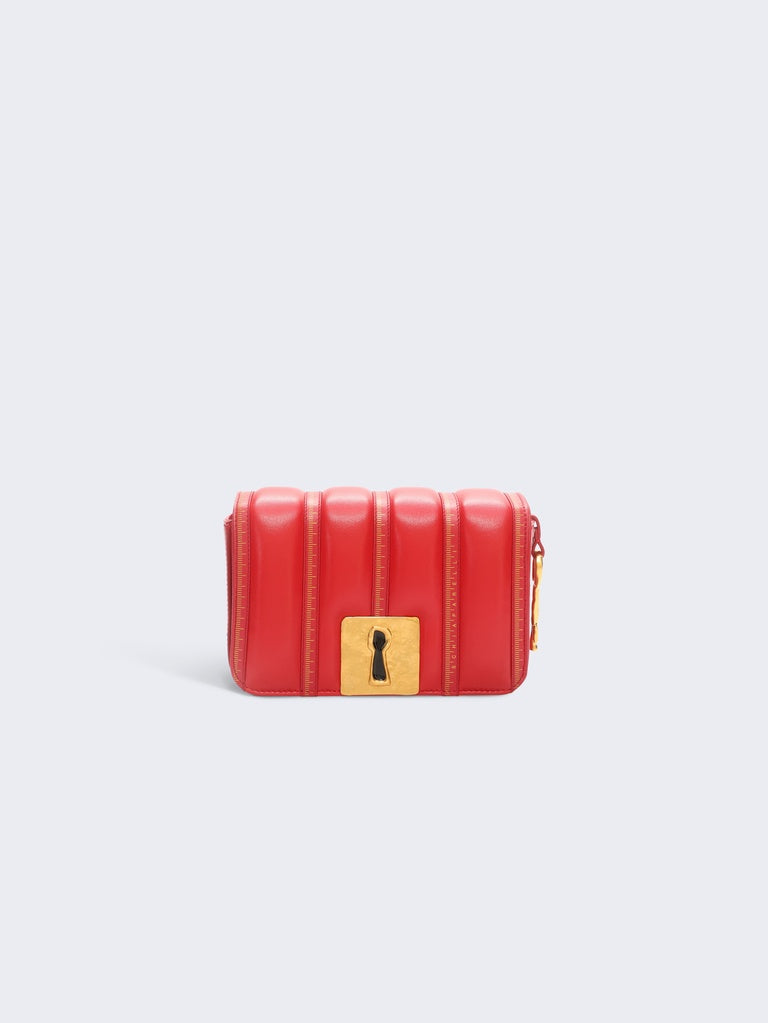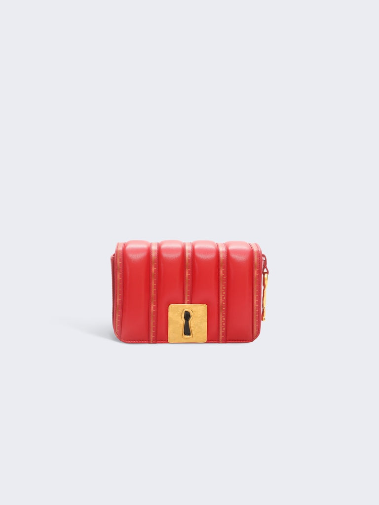 Ce petit sac Schiap est confectionné dans un cuir trapunto rouge ton sur ton embossé du motif Mètre Ruban signature et orné d’une plaque Trou de Serrure signature, d'une chaîne à maillons et d'un bijou Clé doré sur le côté.