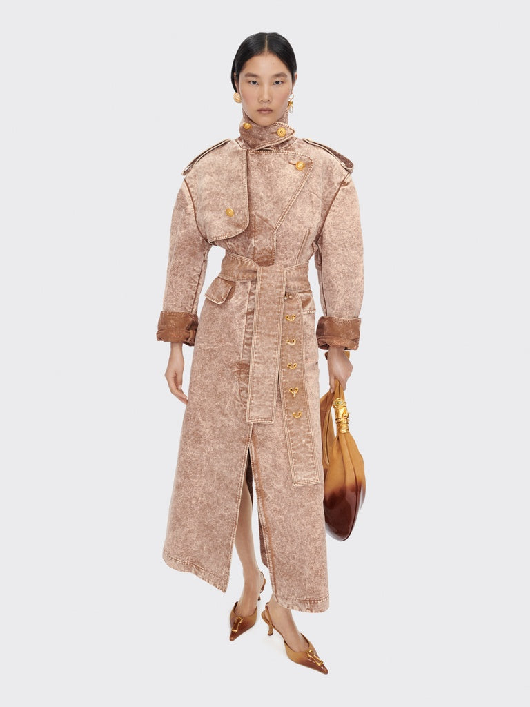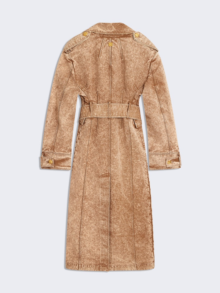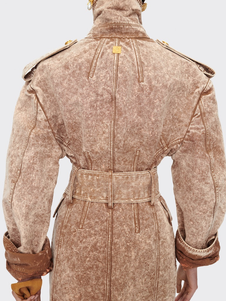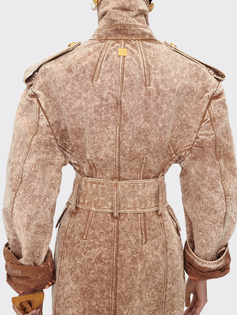 Ce long trench à simple boutonnage en coton parfait surteint et délavé en marron est rehaussé de boutons bijoux et une ceinture ornée de piercings décoratifs pour cintrer la taille.