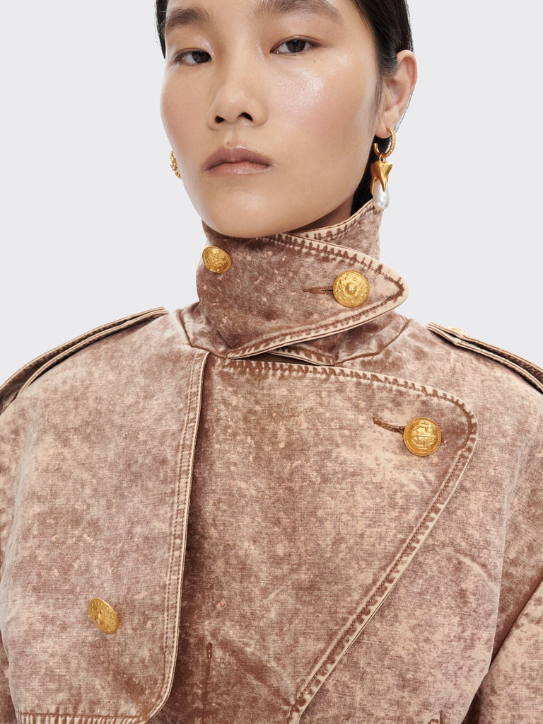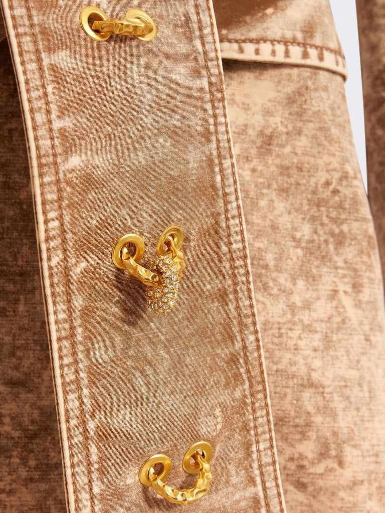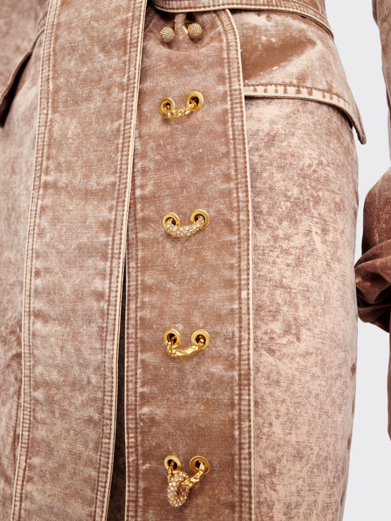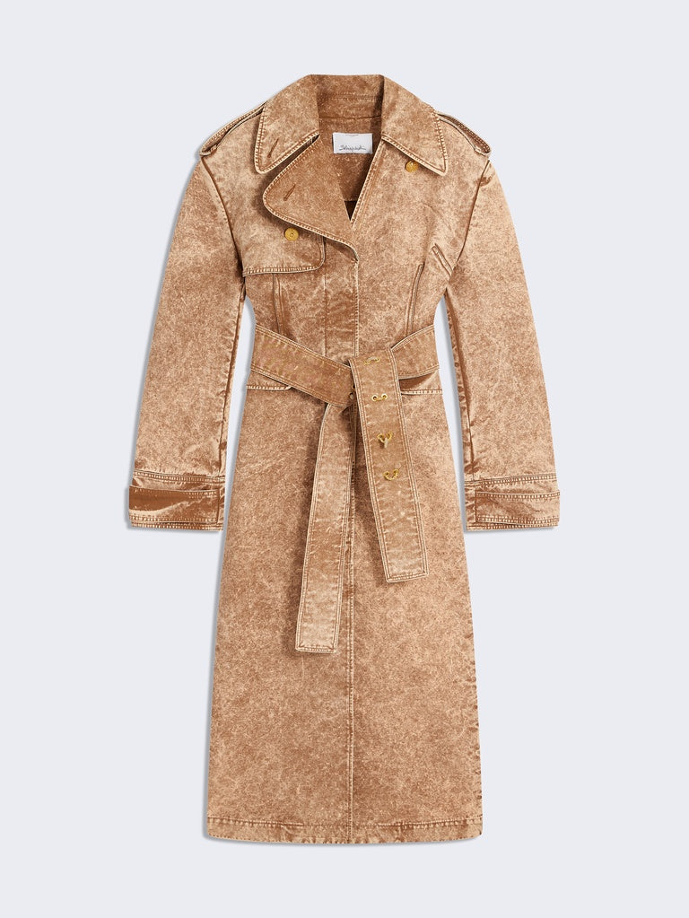 Ce long trench à simple boutonnage en coton parfait surteint et délavé en marron est rehaussé de boutons bijoux et une ceinture ornée de piercings décoratifs pour cintrer la taille.