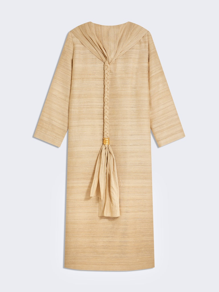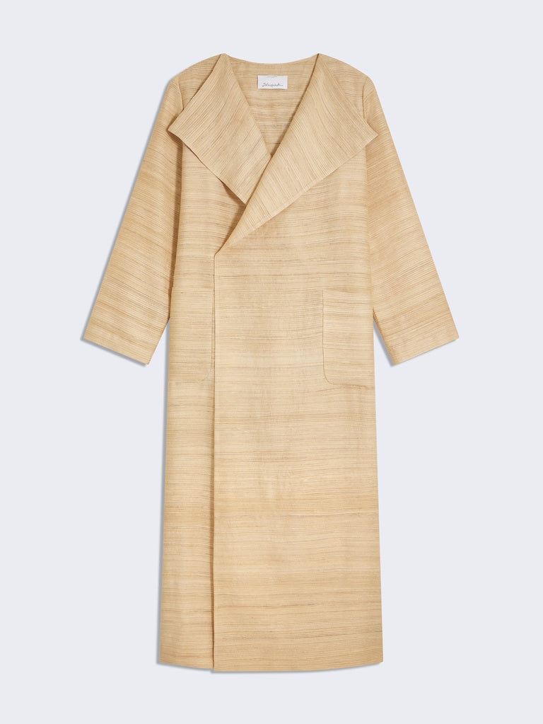 Ce long trench fluide en tussah de soie sable tombant au niveau des épaules est rehaussé de poches sur le devant, d'une tresse qui part du faux bavolet au dos et de larges manches droites.
