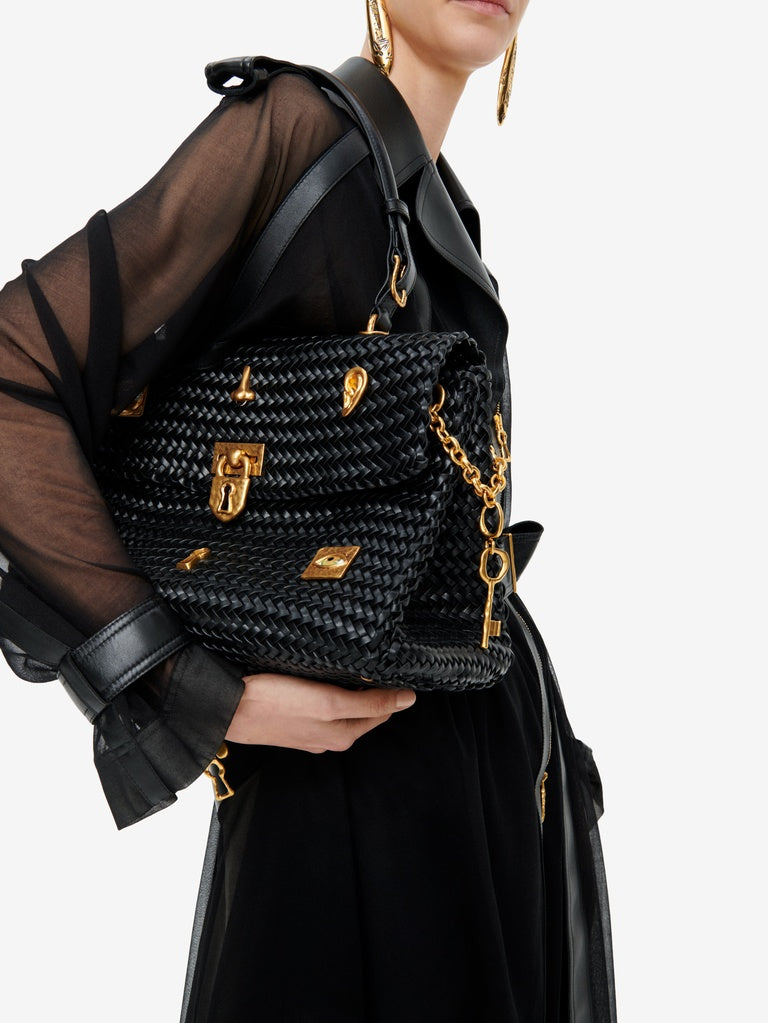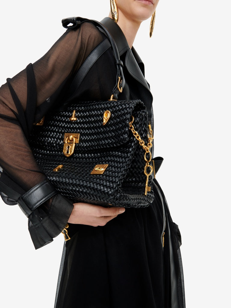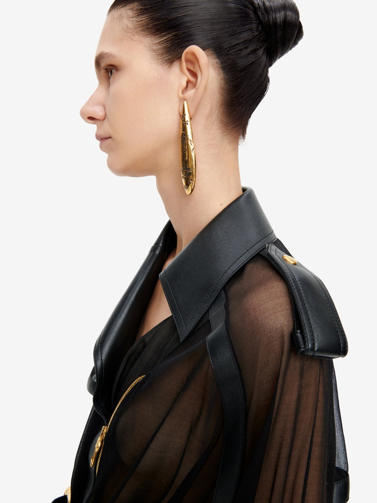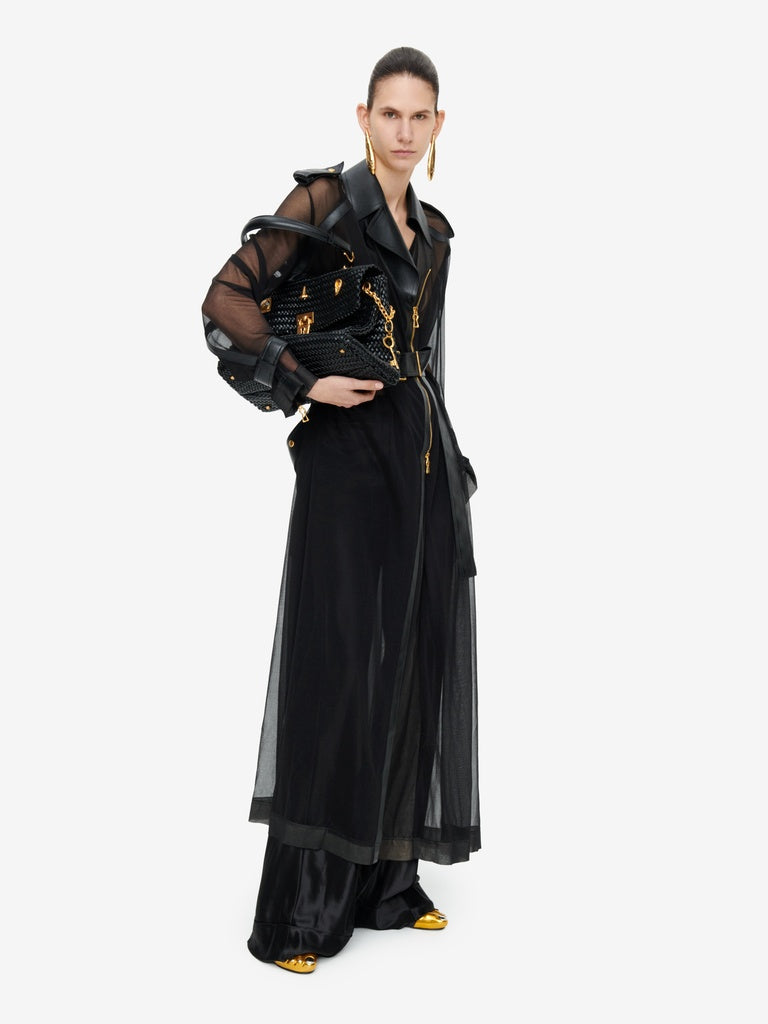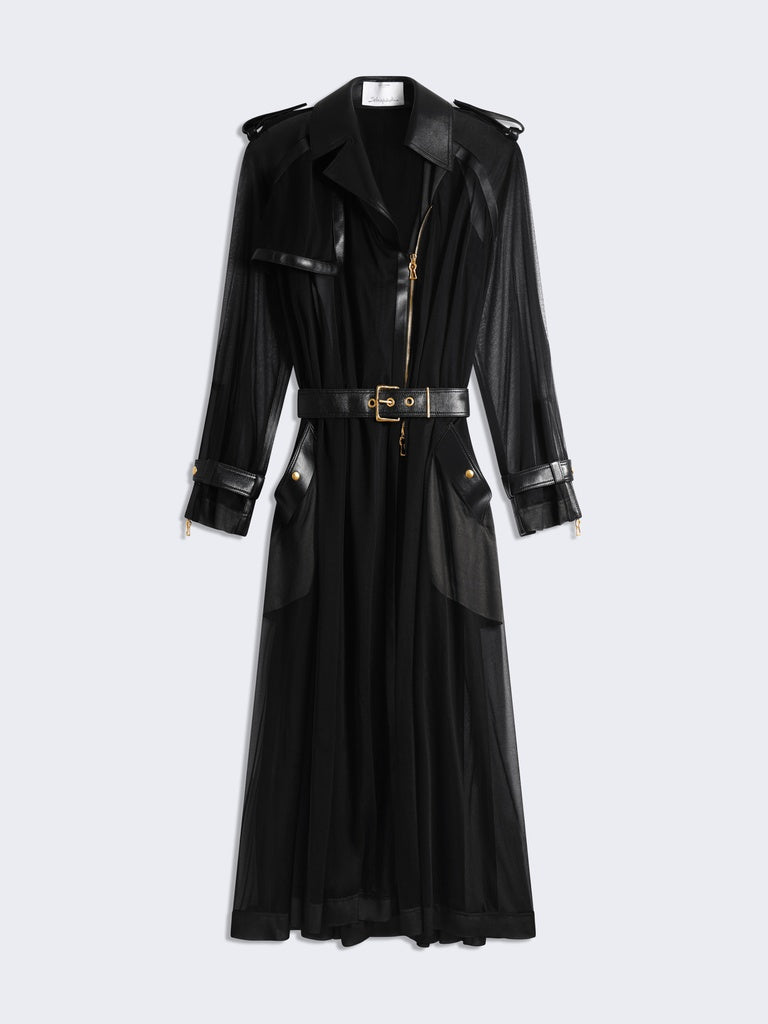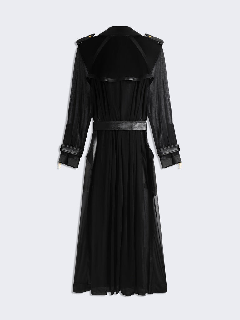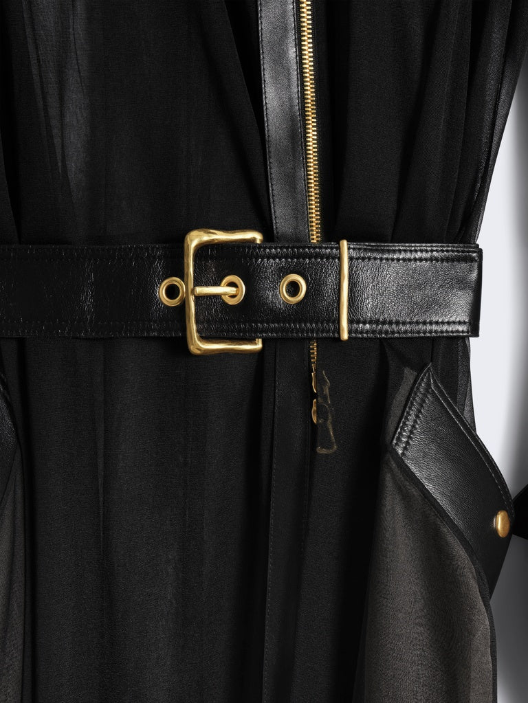 Ce trench est réalisé en jersey transparent noir agrémenté d'empiècements en cuir d'agneau ton sur ton. Il est rehaussé d'un zip en métal doré au milieu devant et aux poignets, d'une ceinture à la taille et de pressions dorées sur les poches, rabat, épaules et poignets.