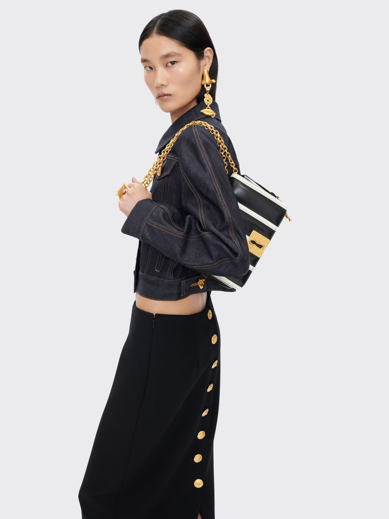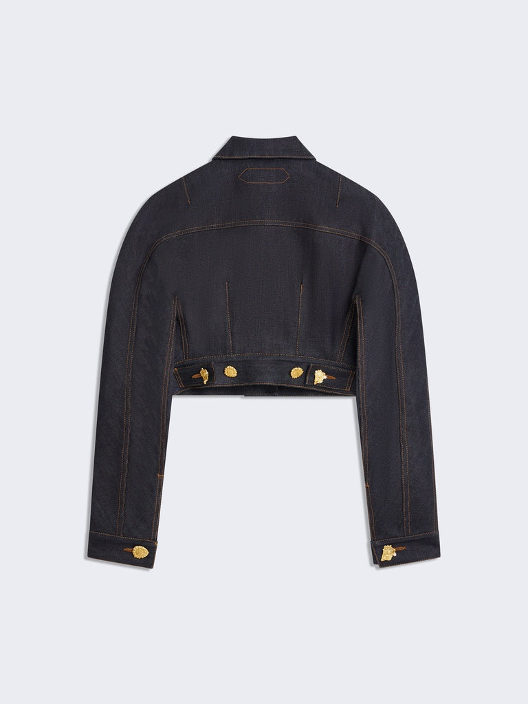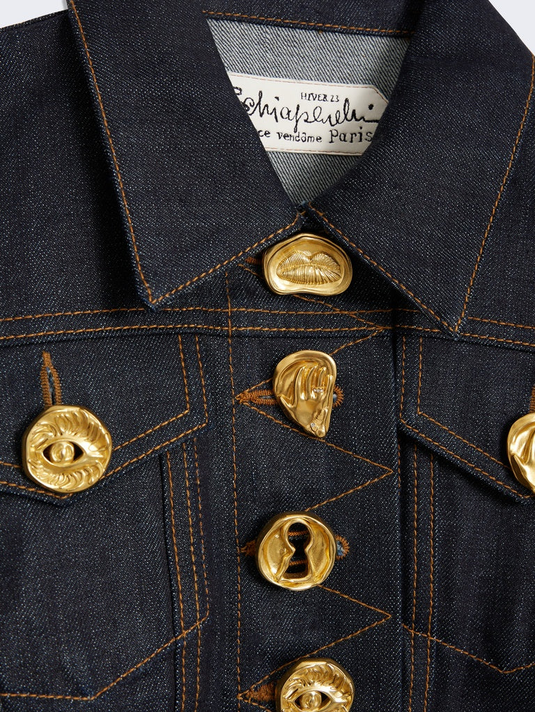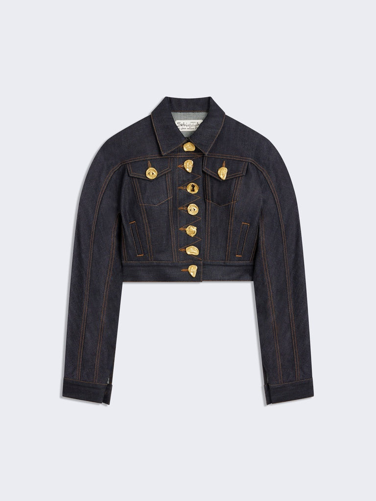 Cette veste courte est réalisée dans un denim brut japonais agrémenté de surpiqures couleur tabac et de détails découpes. Sa coupe courte aux épaules exagéréments arrondies revisite la classique veste en jean à poches poitrines. Elle est réhaussée de boutons bijoux en laiton martelé doré sur le devant, d'une patte de réglage au dos pour ajuster la taille et d'un patch en cuir signé Schiaparelli à l'intérieur.
