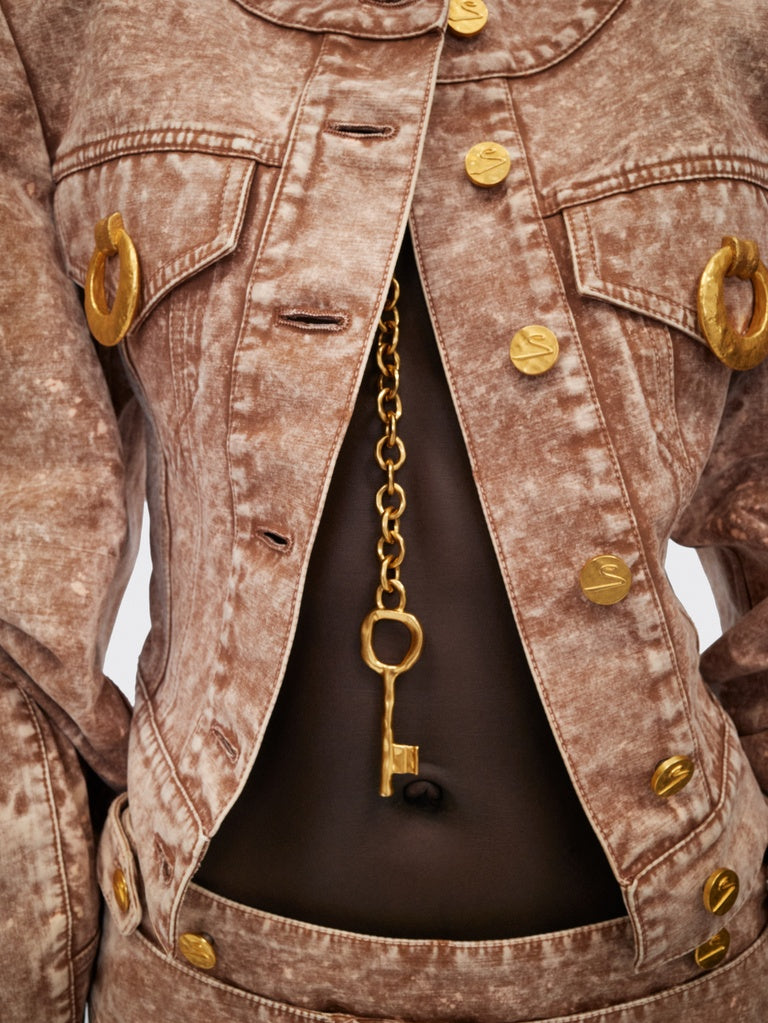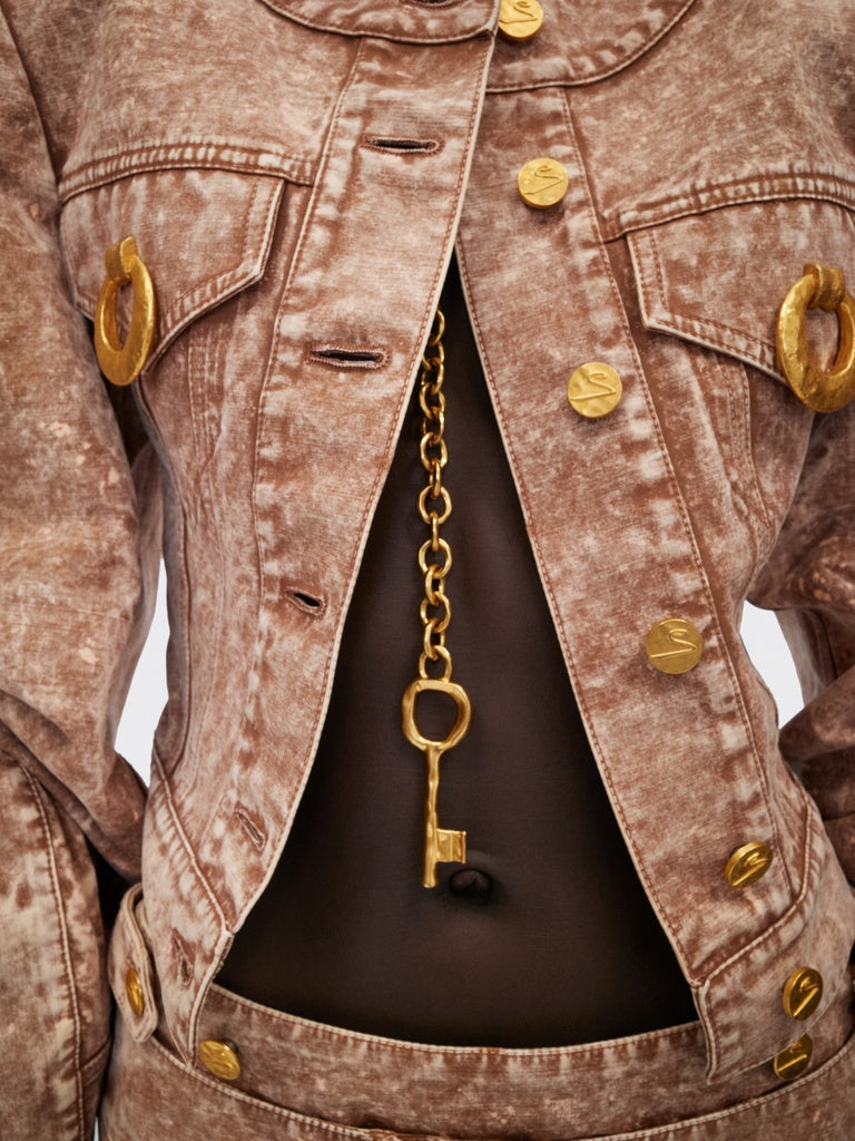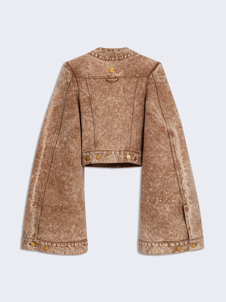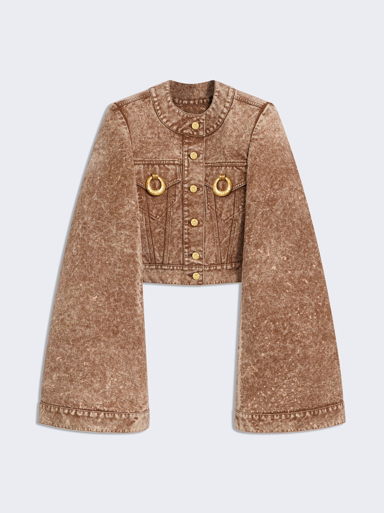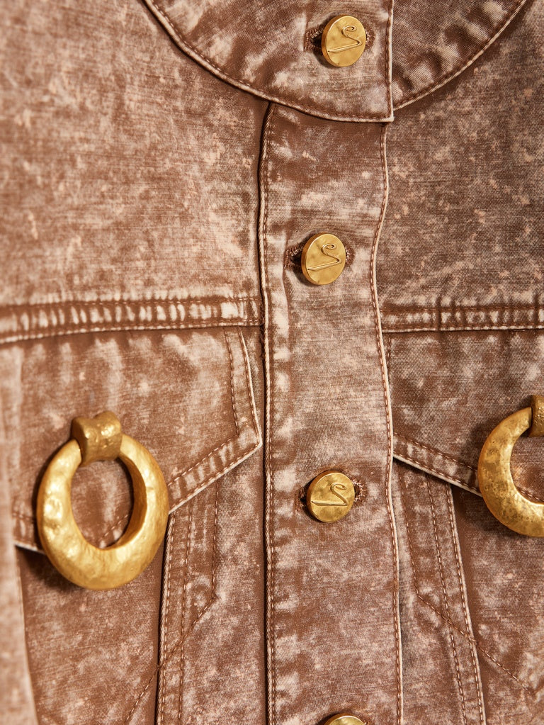 Cette veste sans col à épaules carrées est réalisée en coton parfait surteint et délavé en marron rehaussé de détails denim. Elle est agrémentée de manches évasées et d'un décolleté vertigineux. Elle est décorée de poches tiroirs trompe l’œil ornées de poignées de porte en métal doré.