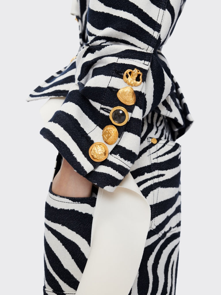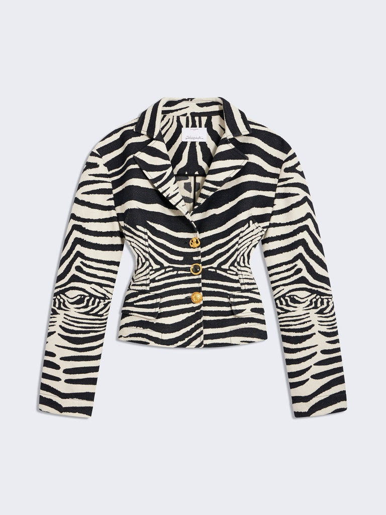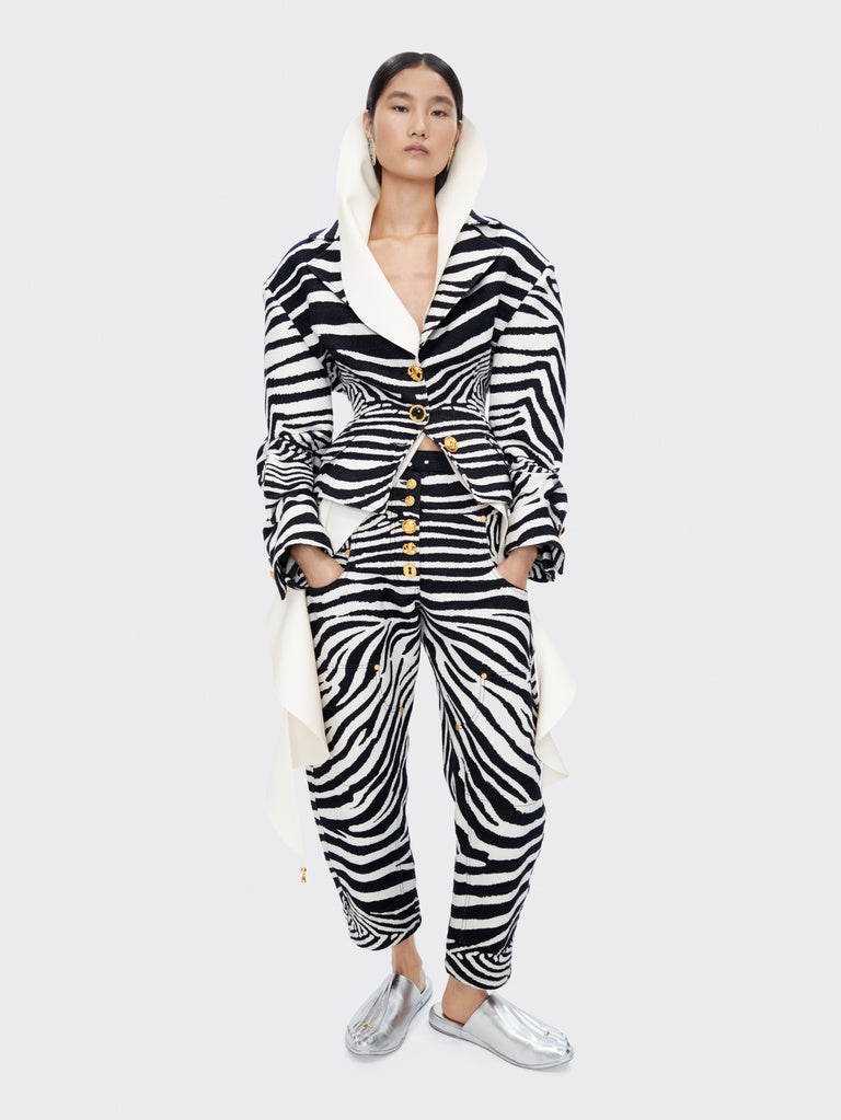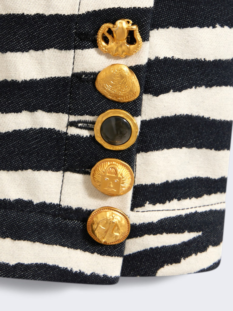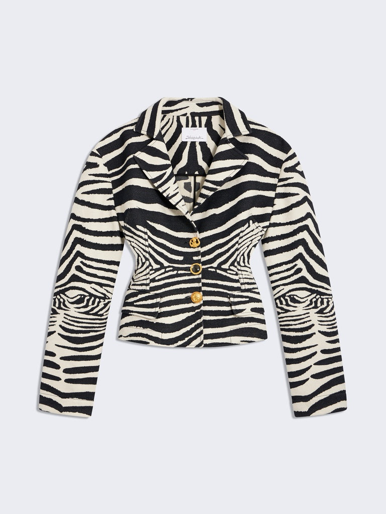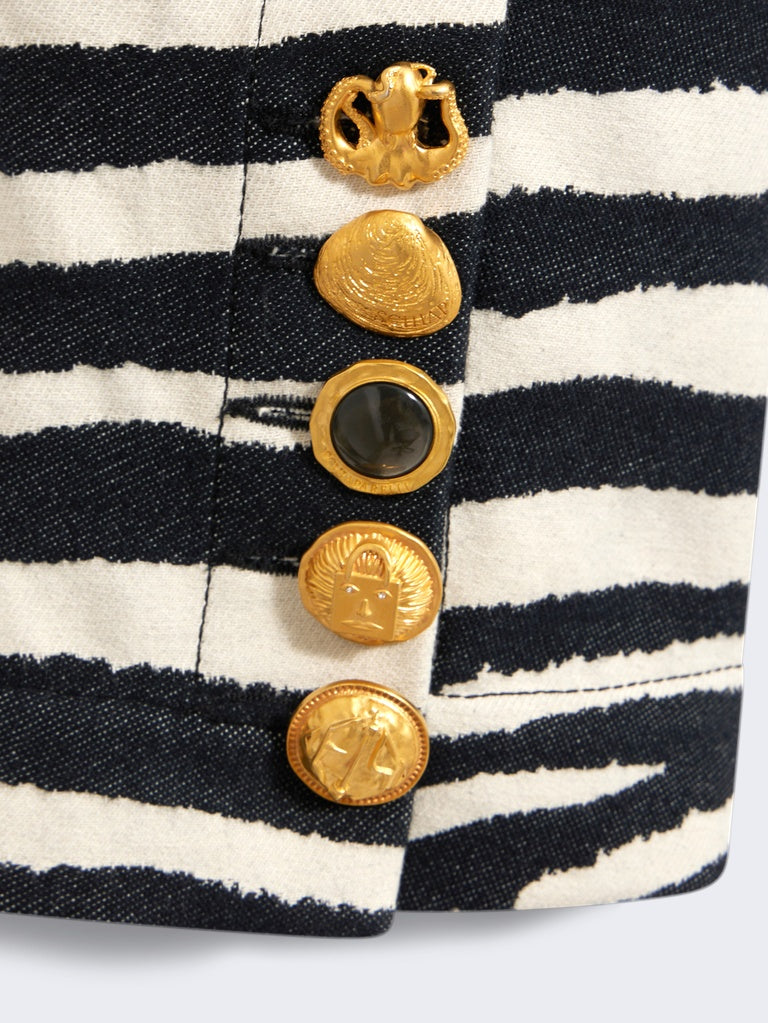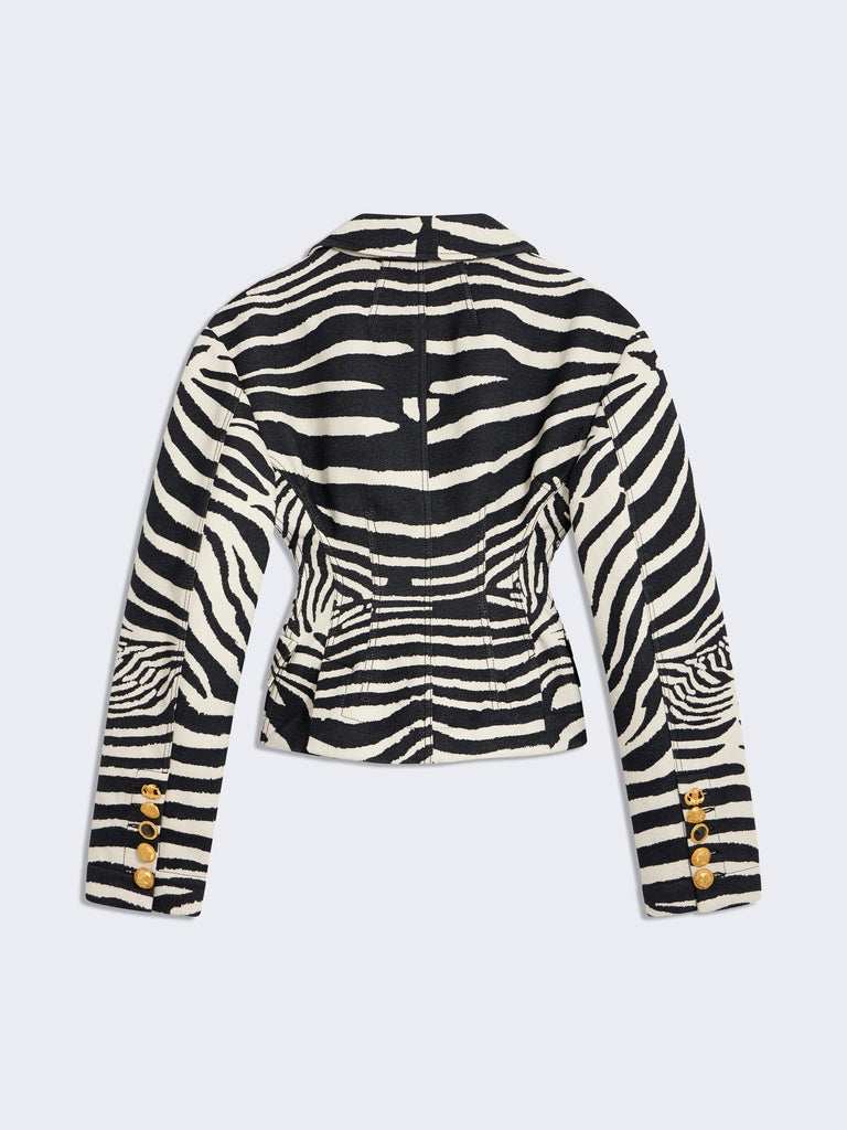 Cette veste cintrée à simple boutonnage et à la carrure légèrement oversize est réalisée en jacquard zébré écru et noir. Elle est décorée de boutons bijoux en laiton doré martelé sur le devant et d'une broderie Mètre Ruban signature ton sur ton sur le revers de col.