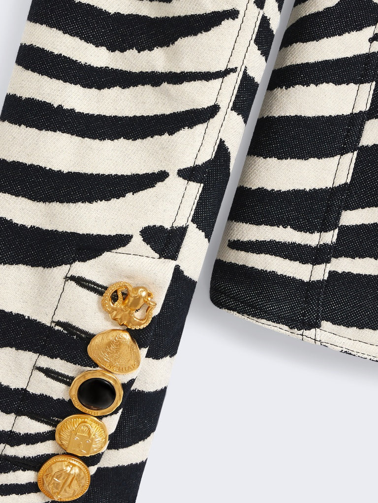 Cette veste ajustée est réalisée en jacquard zébré écru et noir. Sa coupe épouse les lignes de la silhouette, se resserrant à la taille et s'arrondissant à l'ourlet. Elle est rehaussée de boutons bijoux en laiton doré martelé et d'une broderie Mètre Ruban ton sur ton sur le revers de col.