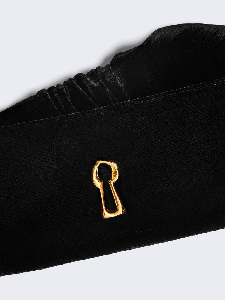This black silk headband is enhanced with a signature hammered gold brass keyhole detail.