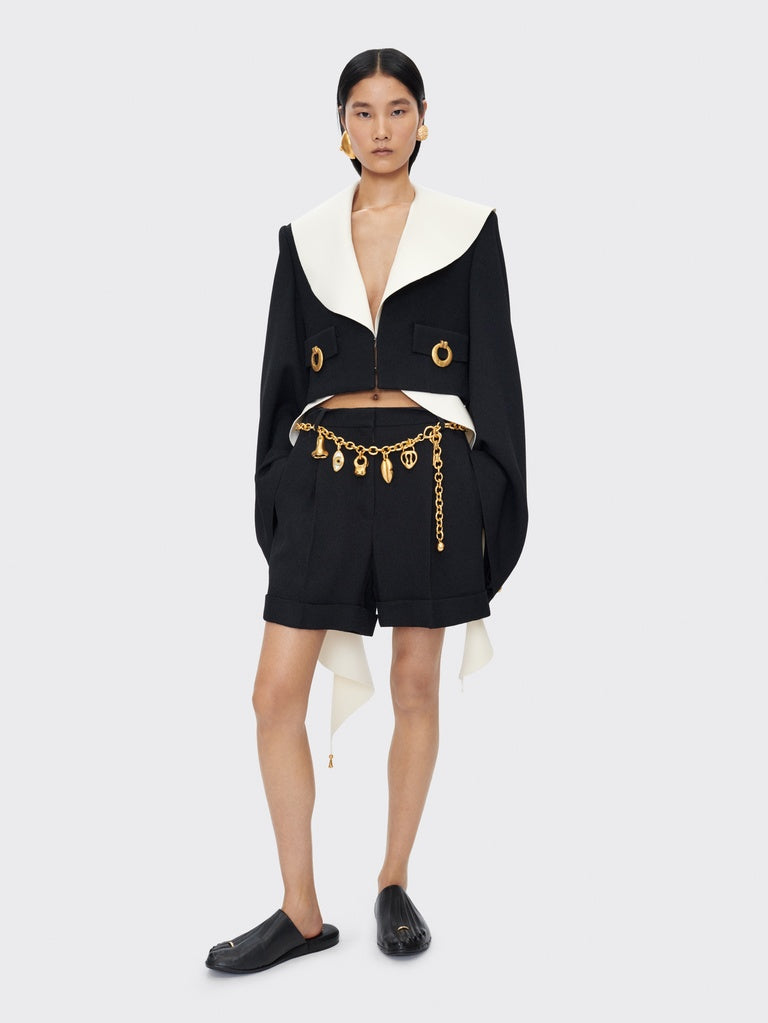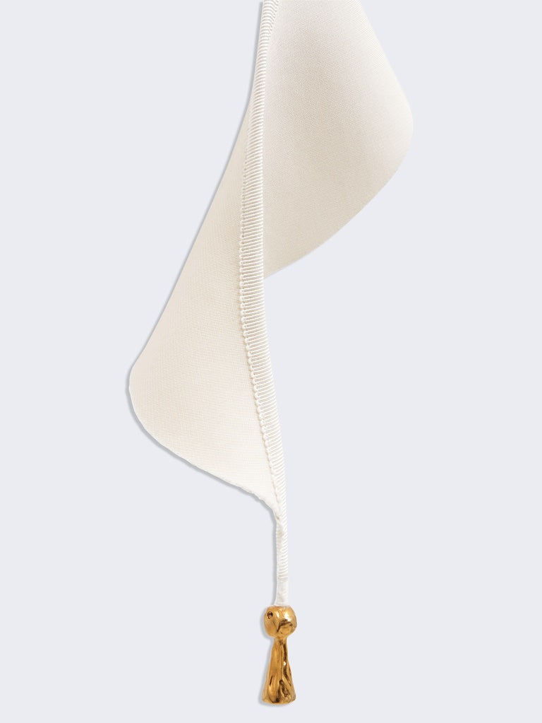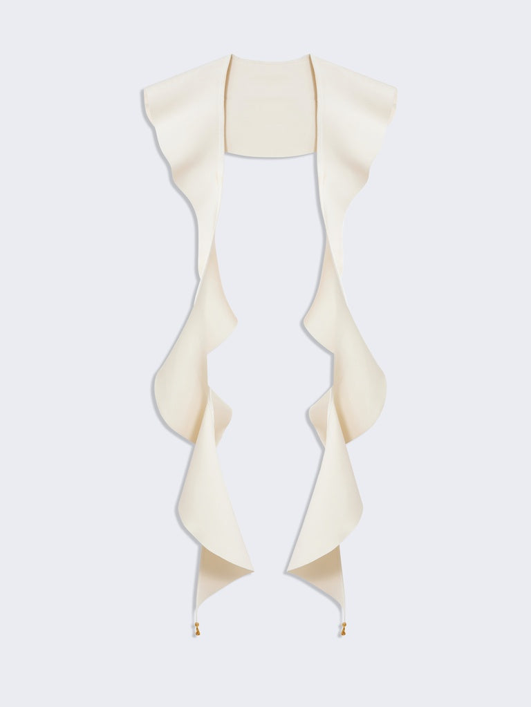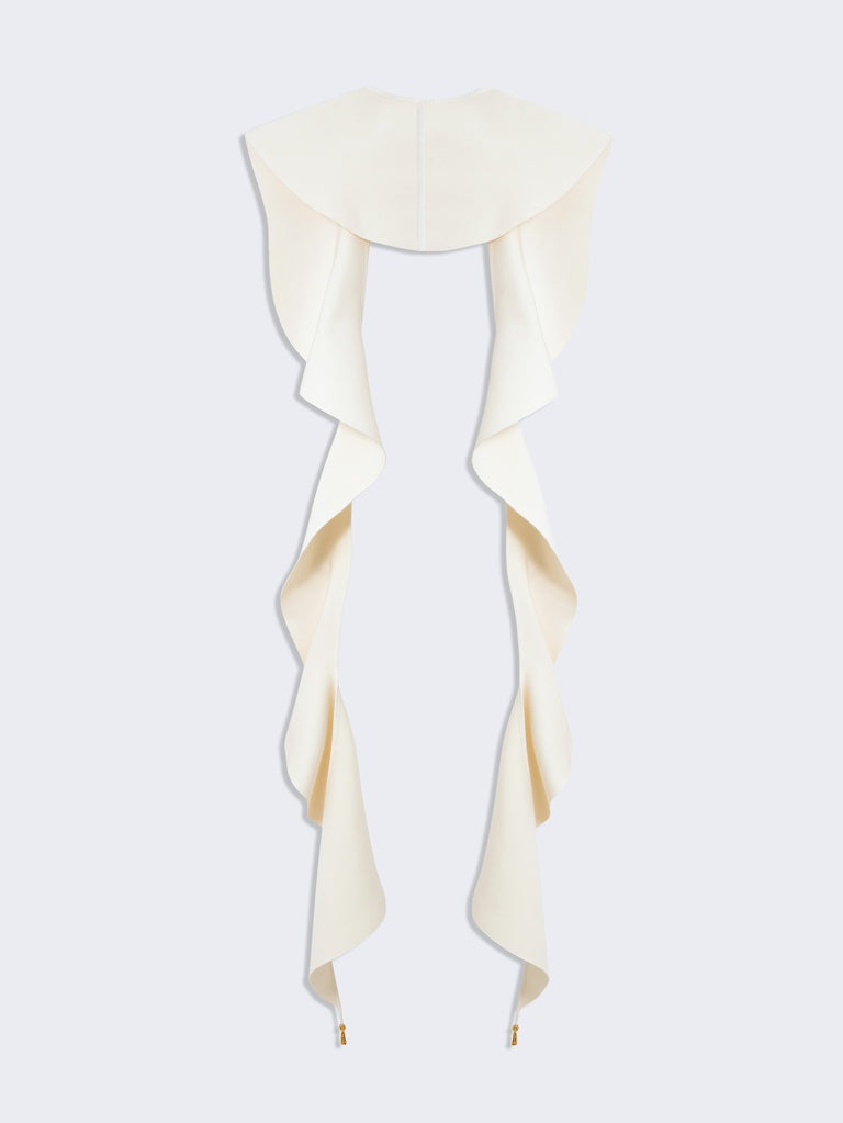 This long ruffle in compact ecru jersey can be combined with many jackets or coats from the collection.