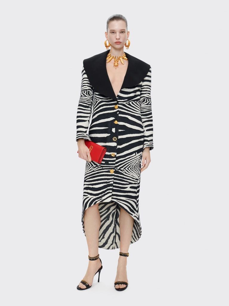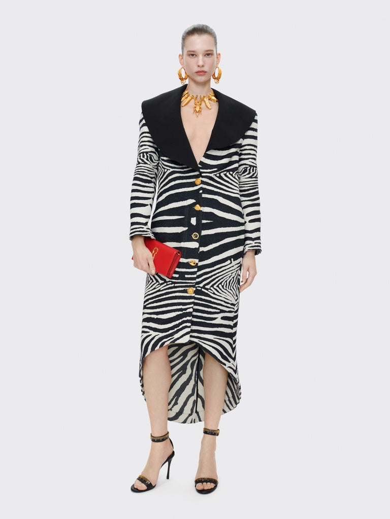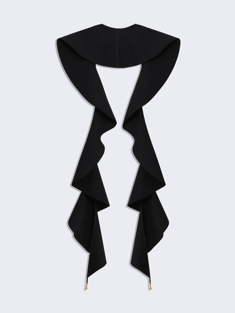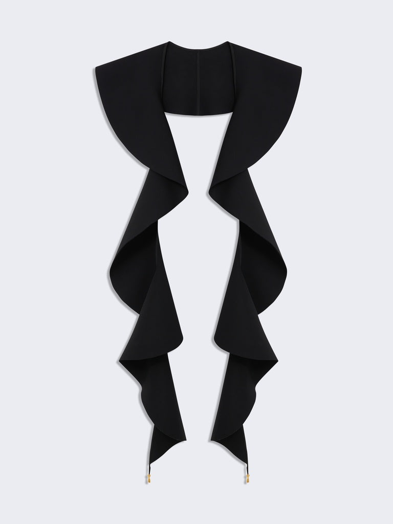 This long, black compact jersey flounce can be combined with many jackets or coats from the collection.