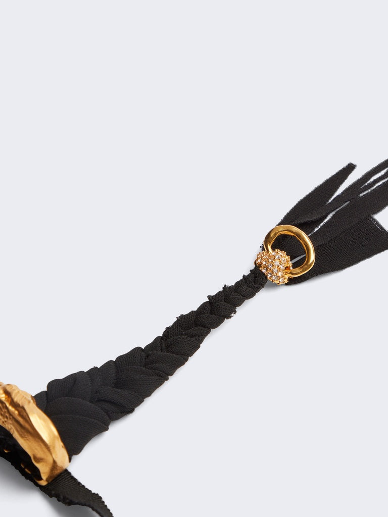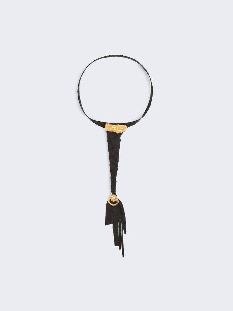 This braided crepe jersey tie is inspired by cowboy culture codes revisited in the Schiaparelli style.
