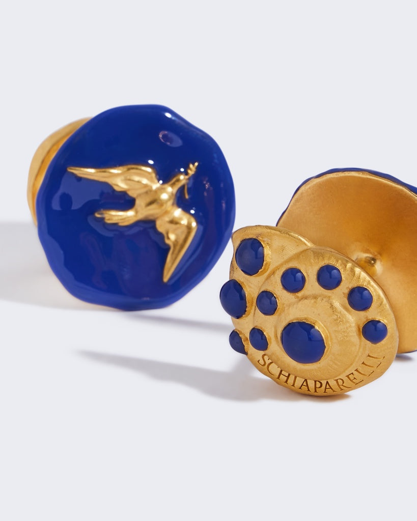 This pair of hammered gold-plated brass and enamel cufflinks, featuring the signature Dove and a snail, is inspired by the Maison's surrealist aesthetic. They fasten with a screw system.