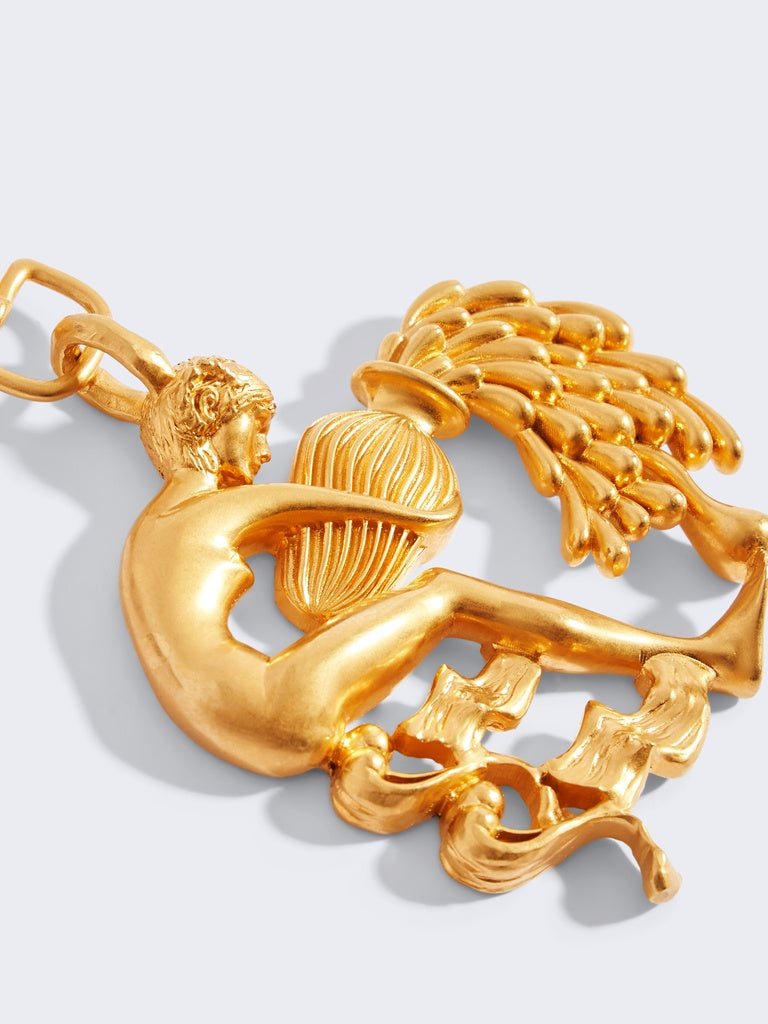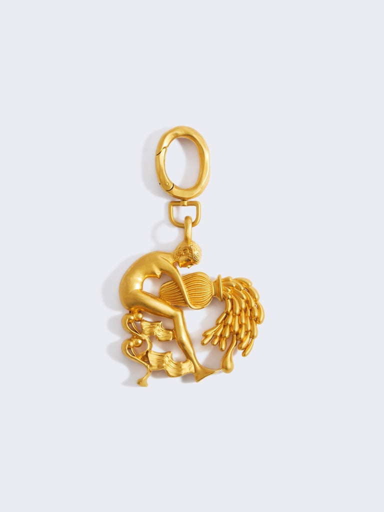 This hammered brass keychain with a gold finish is inspired by Elsa Schiaparelli's passion for the signs of the zodiac. It can be attached to keys, slipped onto a belt loop, or clipped to a bag to add a touch of Schiaparelli magic to any outfit.