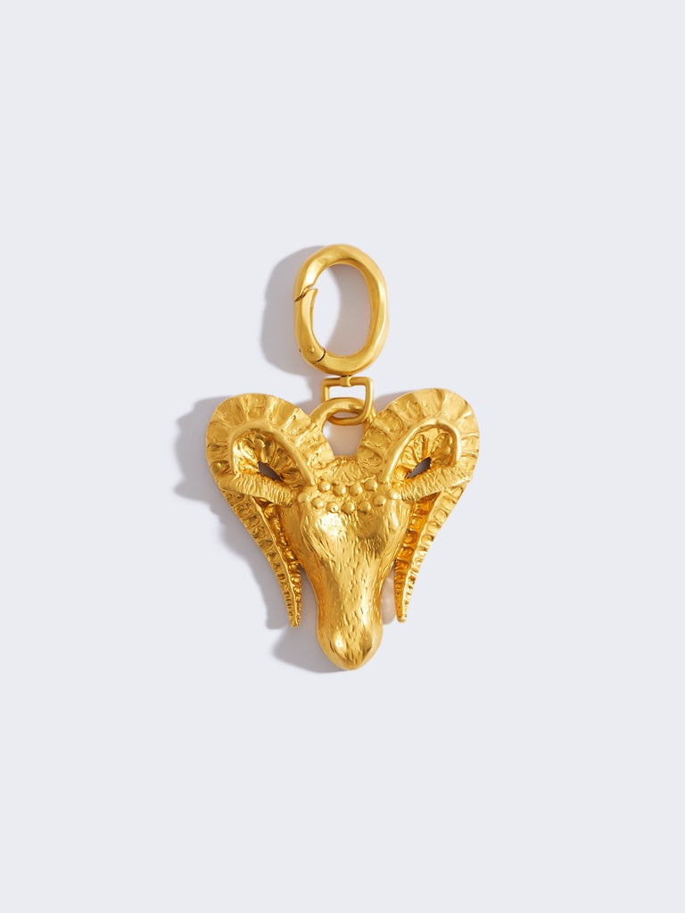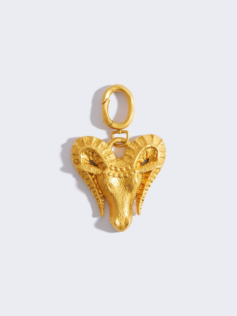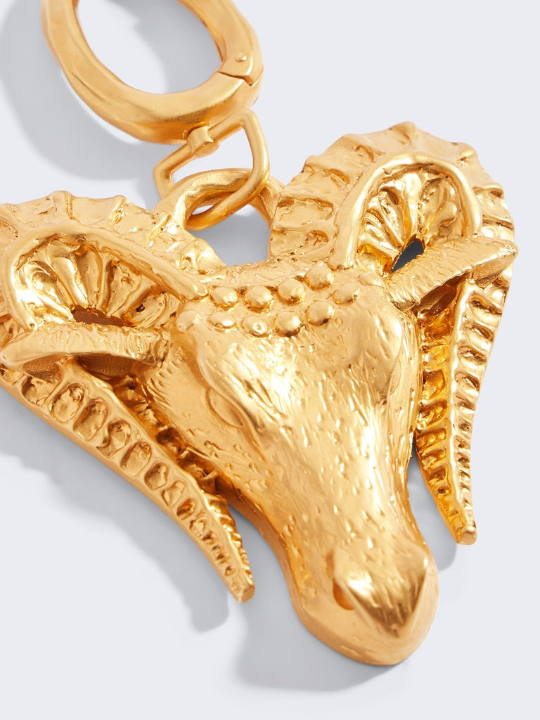 This hammered brass keychain with a gold finish is inspired by Elsa Schiaparelli's passion for the signs of the zodiac. It can be attached to keys, slipped onto a belt loop, or clipped to a bag to add a touch of Schiaparelli magic to any outfit.