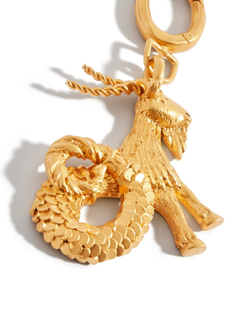 This hammered brass keychain with a gold finish is inspired by Elsa Schiaparelli's passion for the signs of the zodiac. It can be attached to keys, slipped onto a belt loop, or clipped to a bag to add a touch of Schiaparelli magic to any outfit.