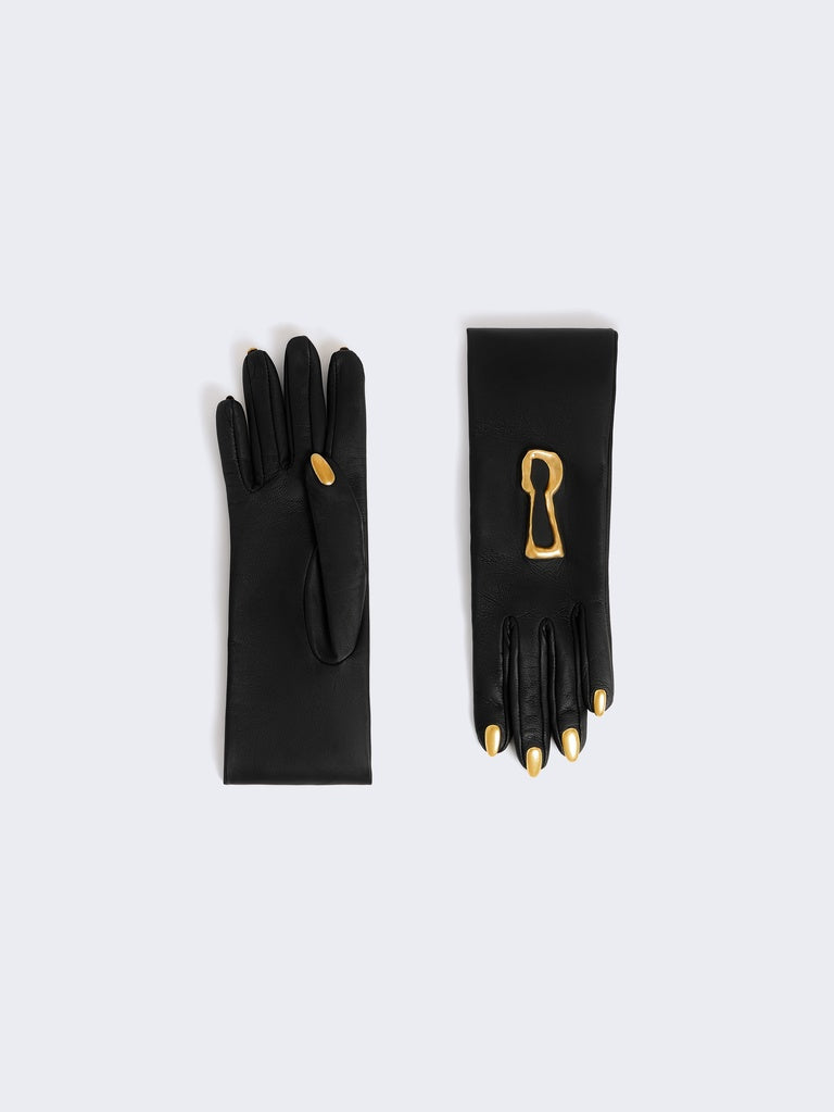 These short gloves in supple black nappa leather with a fluid feel are decorated with the House's signature lock detail and trompe-l'oeil nails in gold metal.