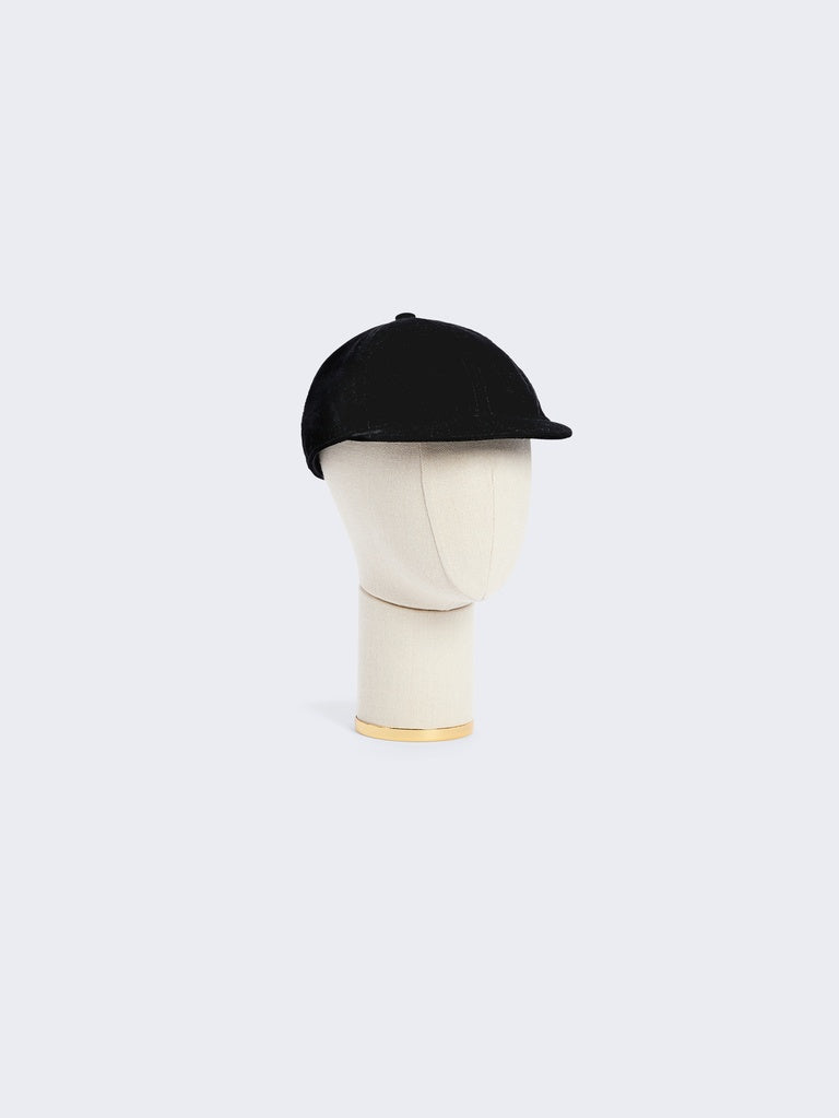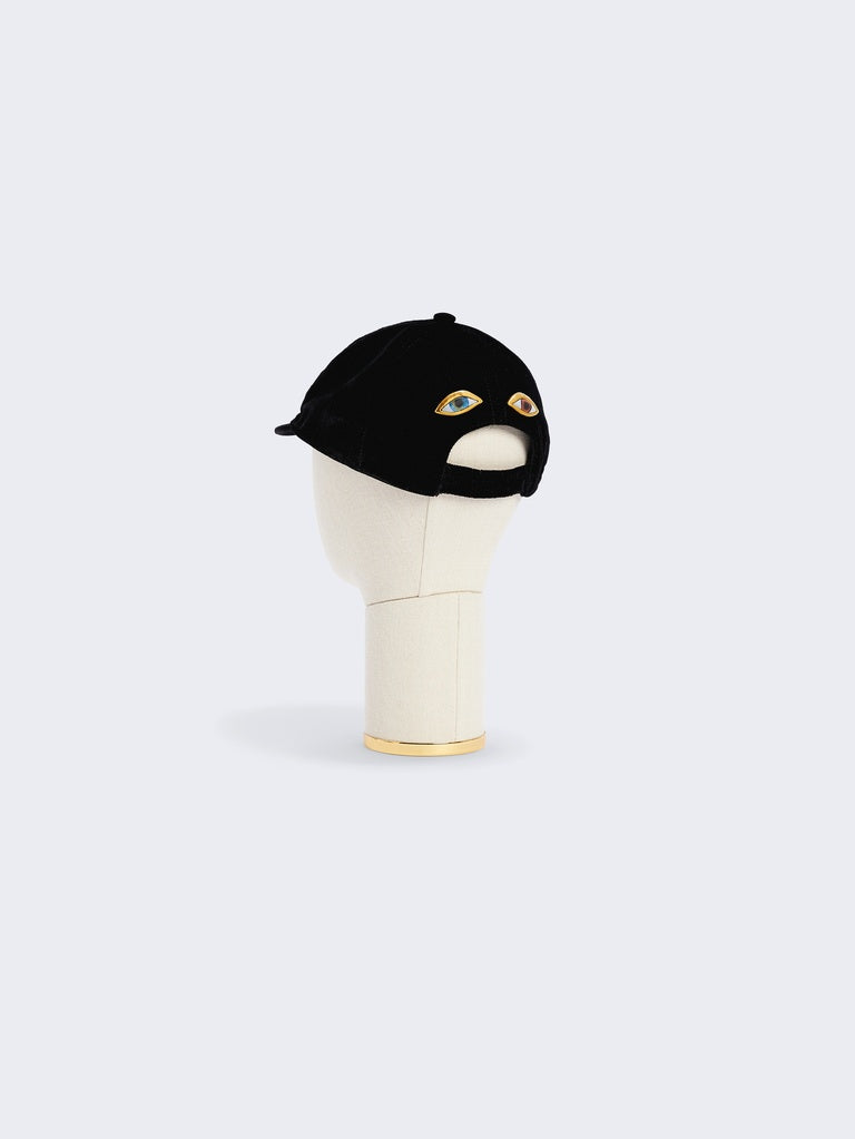 This short-visored cap in black velvet, adorned with a pair of signature Eyes jewels in enamel and hammered gilt brass on the back, pays homage to the surrealist aesthetic of the House.