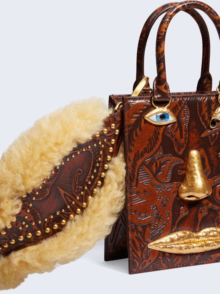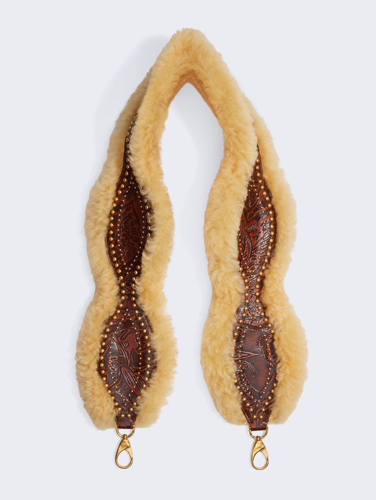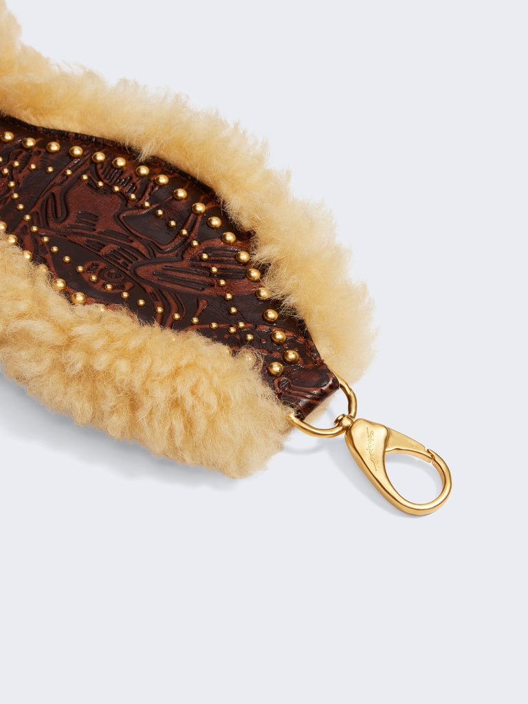 This removable western-inspired shoulder strap is made of glossy calfskin leather decorated with western-inspired studs and lined with shearling.