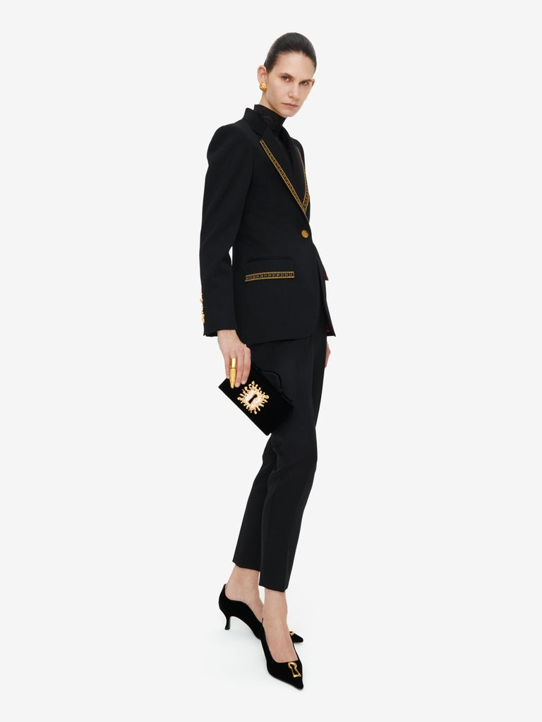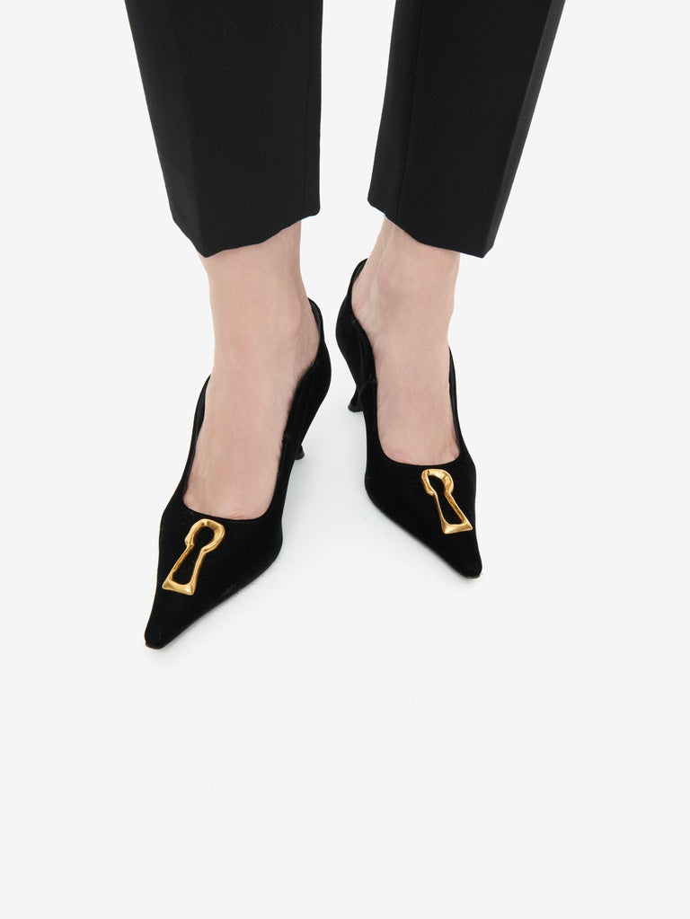 This pointed-toe pump in black velvet, with a leather lining, is adorned with the signature gold lock detail, an iconic code of the Maison.